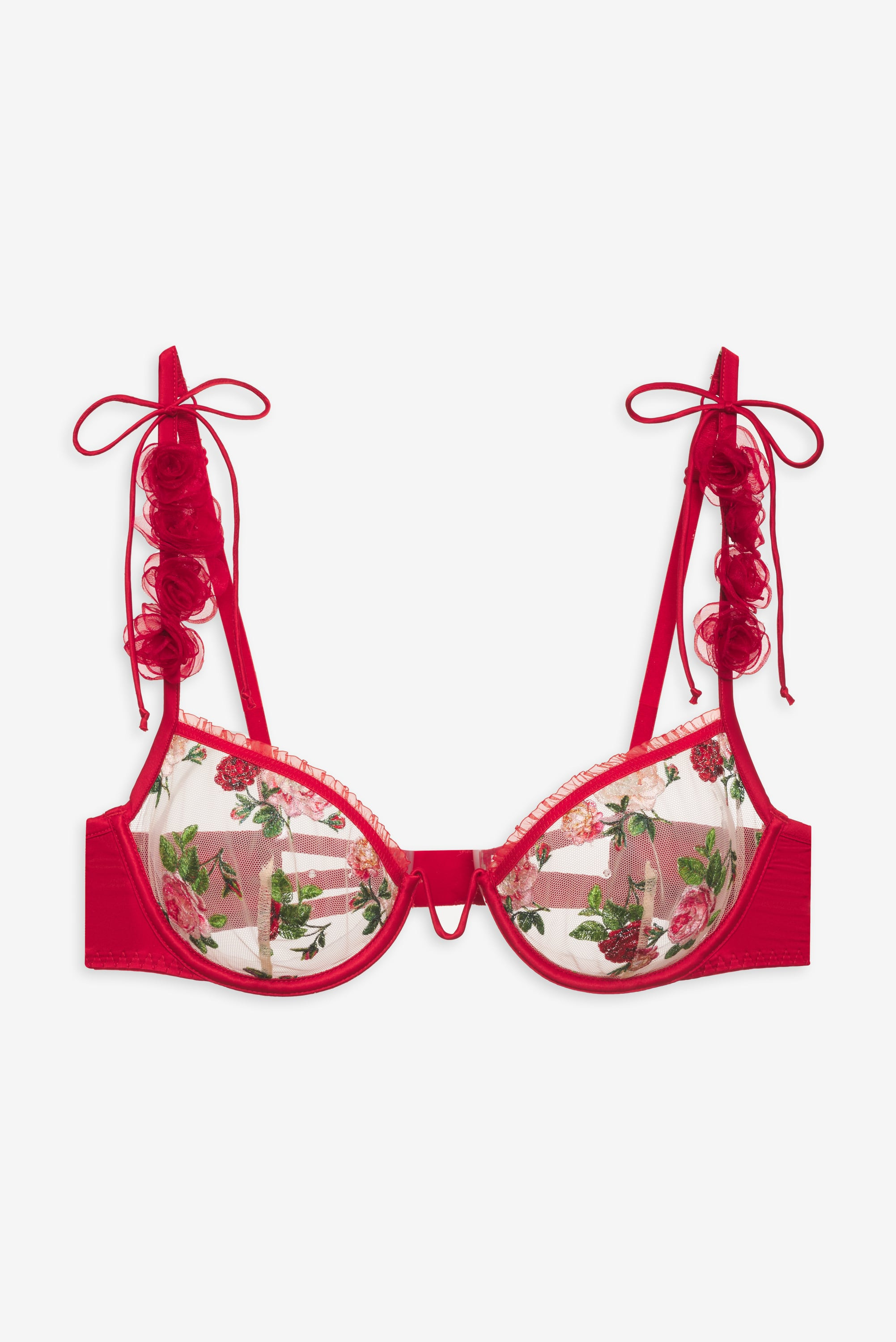 Bouquet baby. Style Notes - Rose embroidery - U shape underwire - Organza rosette detailed shoulder straps - Elastic caged back detail - Hook & eye closure Fabric + CareSelf: 100% Polyester; Embroidery: 97% Polyester/ 3% Other Fiber; Contrast: 62% Polyester/ 33% Recycled Polyester/ 5% Elastane Hand Wash Separately Air Dry With Care