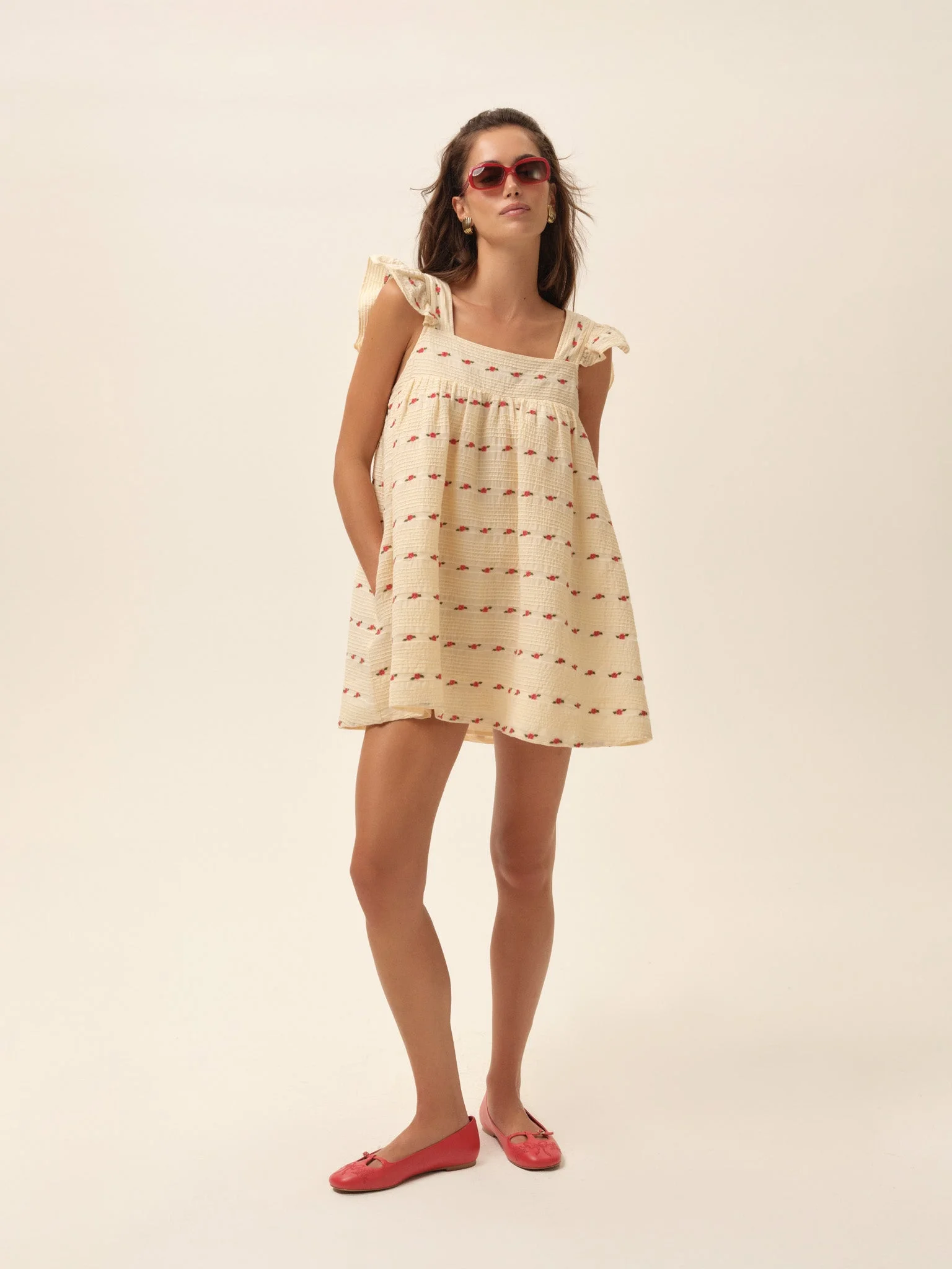 A cream babydoll mini dress with red floral embroidery, flutter sleeves, and inseam pockets, designed to feel a touch cutesy and effortlessly nostalgic. Style Notes - Ruffled flutter sleeves - Square neckline with yoke seams - Elasticized smocking at back neckline - Functional inseam pockets - Fully lined Fabric + Care - Crafted in 100% cotton - Lining is made of 100% cotton - Embroidery is made of 100% polyester - Machine wash cold - Gentle cycle lay flat to dry - Warm iron ok - OK to dry clean