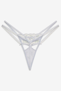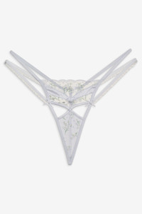 Delicate Baby’s Breath embroidery lends a sense of romance to this blue G-string. Featuring seductive cut-outs, decorative satin bows at the front and back, and a scalloped lace edge at the center-front waist—this thong underwear is sweet and not-so-innocent. Pair it with the matching Baby's Breath Underwire Bra. Style Notes - Decorative ruffled elastic hip strap Fabric + Care - Crafted in 100% polyamide - Embroidery is made of 100% polyester - Satin is made of 95% polyester, 5% elastane - Gusset is made of 100% modal - Hand wash cold