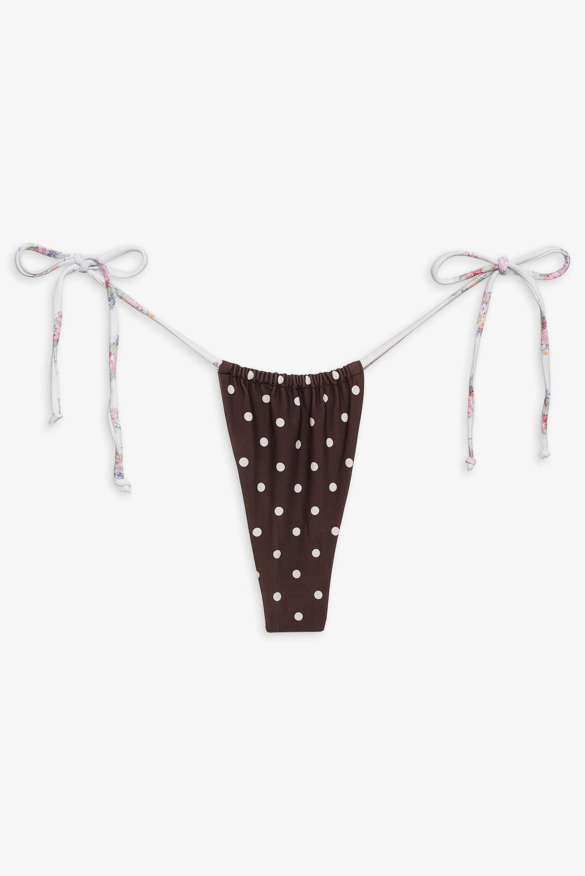 An effortlessly feminine take on a classic silhouette—the Bay thong bikini bottom is crafted in a contrast doily floral bouquet and chocolate brown dot print. This string bikini bottom features functional ties at hips for an ultra-flattering fit. Pair it with the Bay Bikini Top for the full bikini set. Style Notes - Unlined - Functional ties at hips - Adjustable front panel width Fabric + Care - Crafted in 80% recycled nylon, 20% spandex - Lining is made of 80% recycled nylon, 20% spandex - Hand wash cold - Drip dry in shade - Do not tumble dry - Do not iron - Do not dry clean