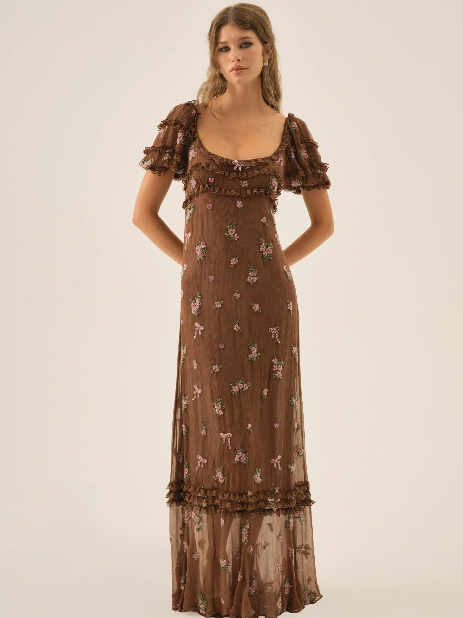 FOR LOVE & LEMONS KEEPSAKES: Ethereal and exquisite, the Beaded Garden brown maxi dress is designed to turn heads at every party. Spotlighting short puff sleeves, tiered lace trims, and intricate hand-beaded bows and florals—this vintage-inspired evening gown is the perfect party dress for winter soirees. Style Notes - Lined in chiffon - Lace lingerie bow at the front neck - Invisible zipper at side seam - Functional keyholes and covered buttons at the center-back Fabric + Care - Crafted in 100% viscose - Dry clean only