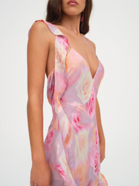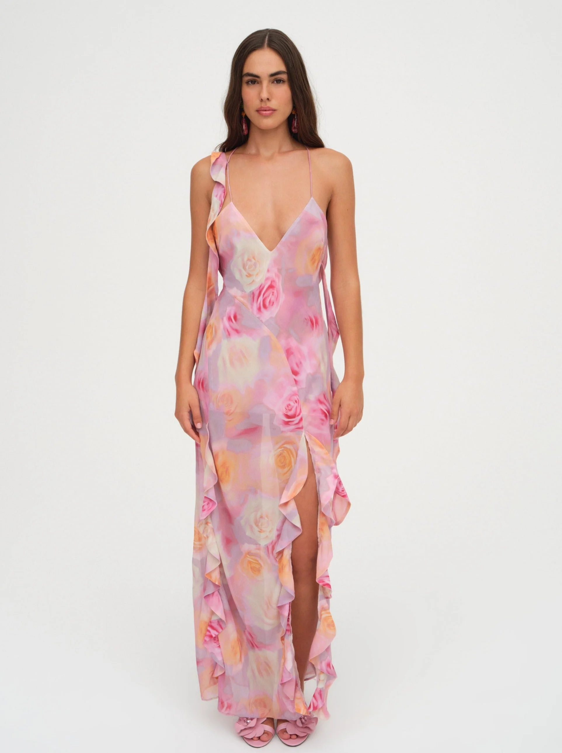 Fun, flirty, and floral—this pink asymmetrical dress features a dreamy rose print and romantic cascading ruffles. The perfect galentines outfit, this floral maxi dress has a removable ruffle at the shoulder and a thigh-high slit for a night of dancing.