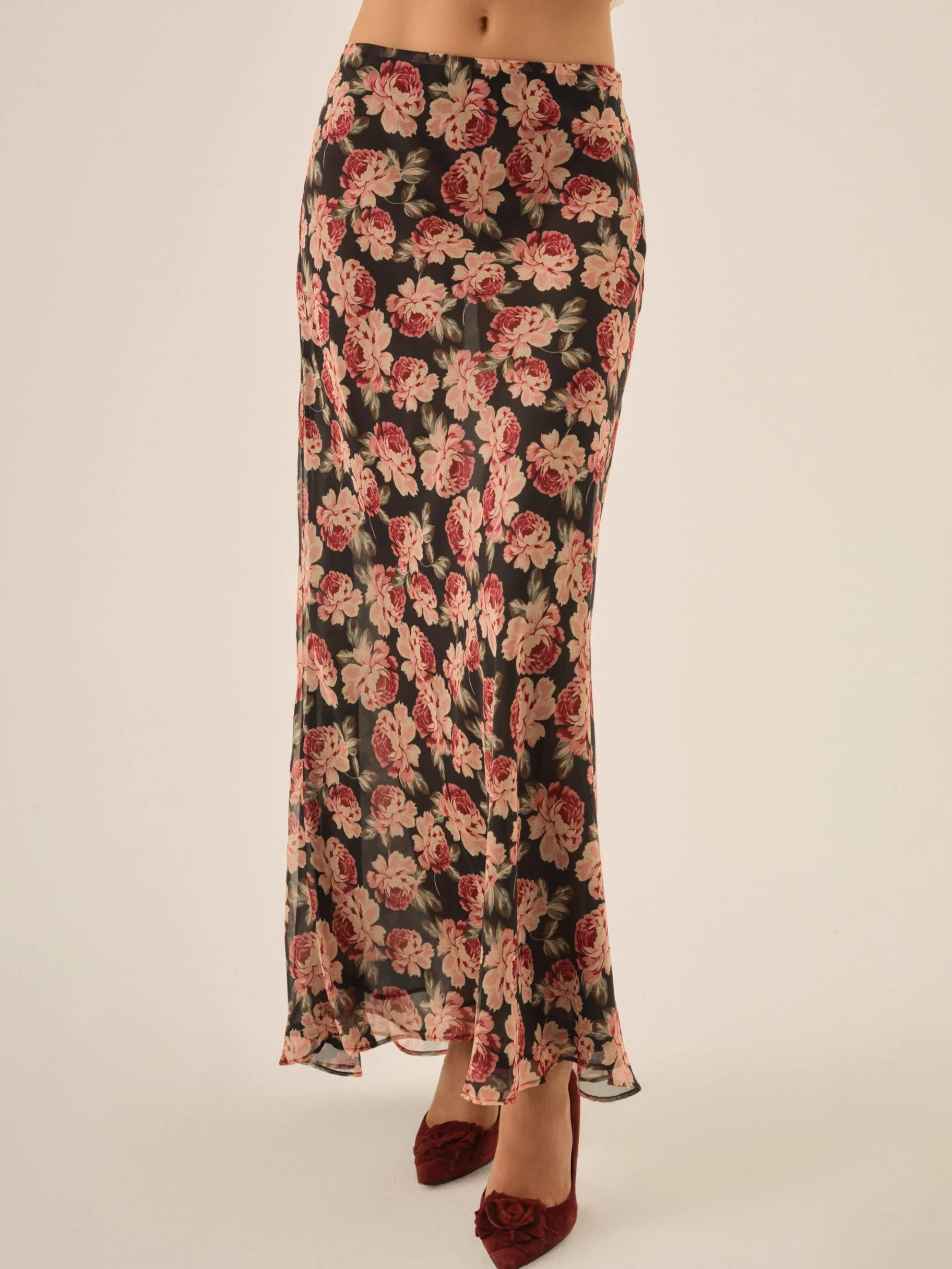 Designed for the ultimate romantic, the Belmond floral maxi skirt exudes femininity with its bias-cut silhouette and romantic floral-printed chiffon. Pair this long floral skirt with your favorite lace separates for a chic winter look. Fit Notes - Sheer style Style Notes - Sheer fabric - Lined in sheer chiffon - Invisible zipper at left side seam Fabric + Care - Crafted in 100% polyester - Lining is made of 100% polyester - Dry clean only