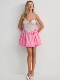 Crafted in a beautiful berry bud velvet and taffeta, the Berry Bud Bubble pink mini dress features a fitted bodice and bubble skirt detail. This floral mini dress spotlights an ultra-feminine fit with a v-neckline, v-shaped waist, and a corset fitting boned bodice that is the perfect balanced blend of sexy and sweet. Style Notes - Fully lined - Adjustable straps - Invisible zipper and left waist - Boning at princess seams Fabric + Care - Crafted in 98% polyester, 2% spandex - Contrast is made of 70% polyester, 24% nylon, 6% spandex - Lining is made of 100% polyester - Dry clean only