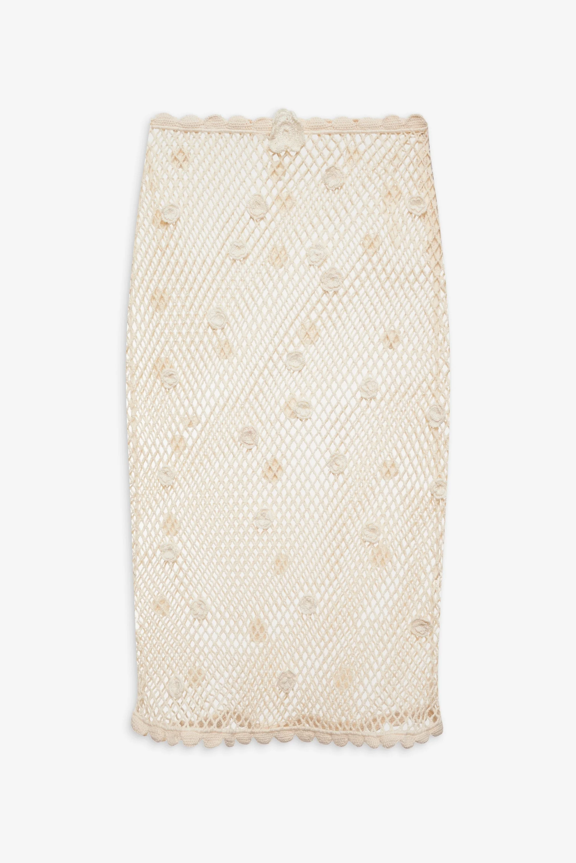 A love letter from the sea–the Betty Bouquet knit midi skirt embodies coastal charm. Crafted in 100% cotton, this pull-on style crochet midi skirt is adorned with crochet flowers throughout and spotlights a scallop trim at waist and hem for an enchanting look. Style Notes - Unlined Fabric + Care - Crafted in 100% cotton - Hand wash in warm water - Lay flat to dry - Cool iron ok - Do not dry clean