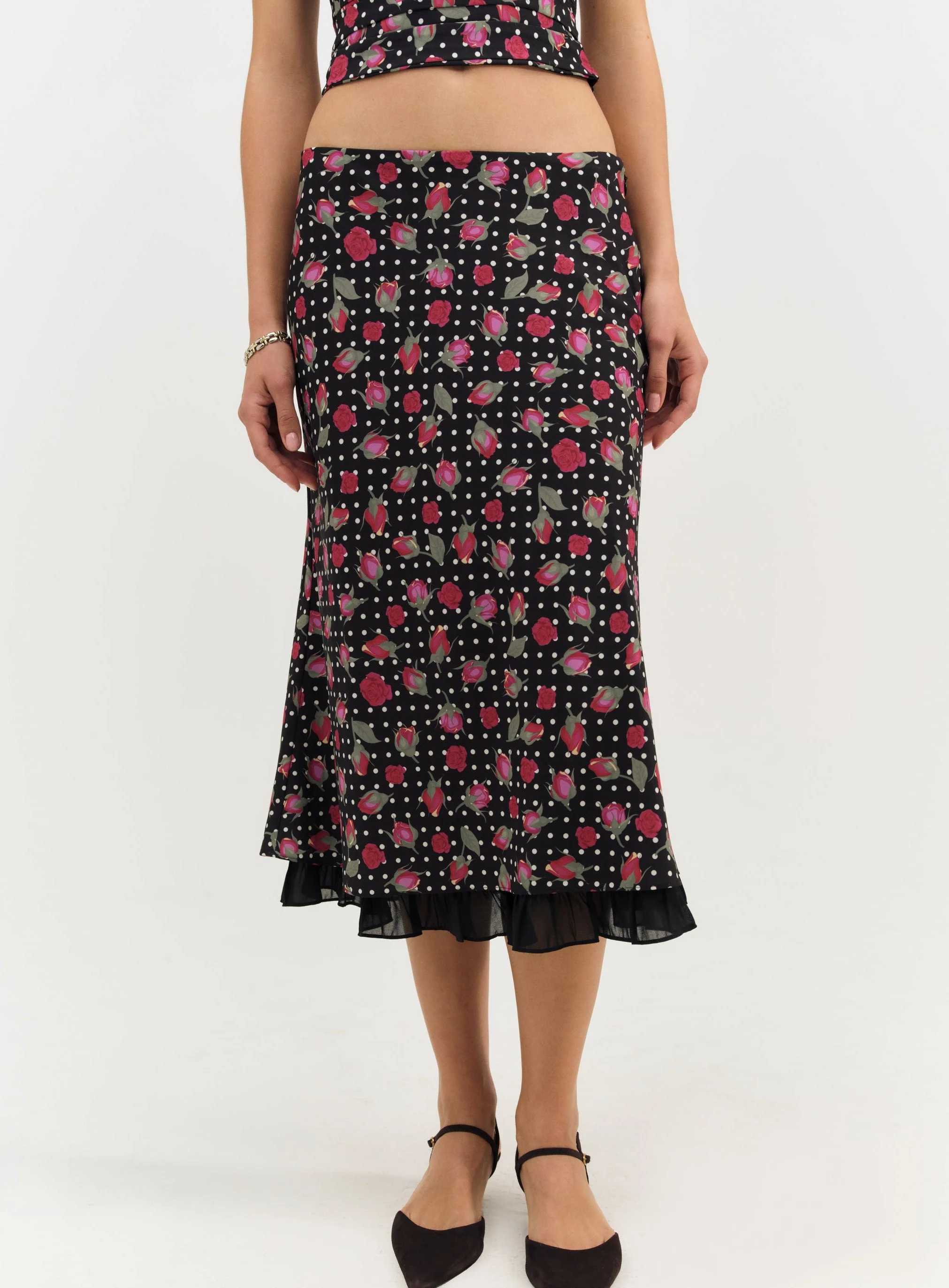 Romanticize the in-between moments of a slower season with the Betty Bud floral midi skirt—a black mini skirt crafted in a romantic red rose and polka dot print. This bias-cut skirt is low-waisted and features a contrast lining that extends past hem. Pair it with the Betty Bud Top to complete the co-ord set. Fit Notes - Low waist fit, size down for high waist fit Style Notes - Fully lined in chiffon - Invisible zipper at left side seam Fabric + Care - Crafted in 100% polyester - Lining is made of 100% recycled polyester - Dry clean only