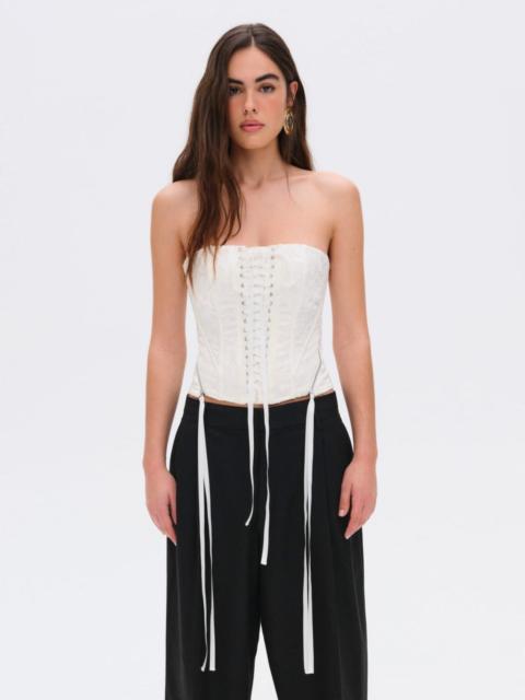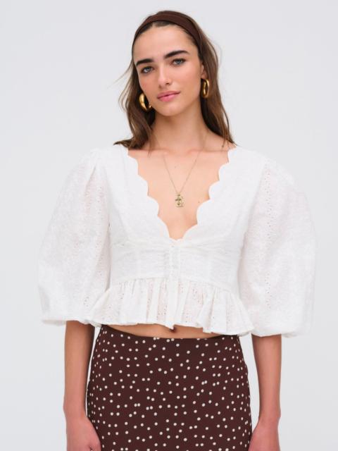 Sweet dreams are made of the Billie cream top—a puff sleeve blouse with contrast poplin sleeves and nostalgic tie-up front. Pair it with the Billie Top for an ultra-cute co ord set. Style Notes - Lining at the cups - Shirring along the underbust - Decorative picot elastic trims Fabric + CareSelf: 47% Polyester/ 47% Rayon/ 6% Spandex; Contrast: 98% Cotton/ 2% Spandex; Lining: 90% Polyester/ 10% Spandex; Eco Dry Clean recommended. Avoid cleaners that use harmful chemicals like "Perc".