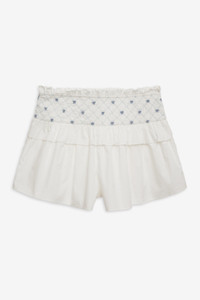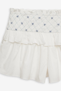Made for barefoot walks, the Birdie Bow Smocked white ruffled shorts exude effortless beauty. Adorned with a dainty blue bow embroidered smocking at waistband, these white shorts fall at mid-waist and feature ruffle detals at the hip and wide leg opening. Style Notes - Cut to a mid-rise Fabric + Care - Crafted in 100% cotton - Lining 100% cotton - Machine wash cold - Lay flat to dry - Cool iron ok - Ok to dry clean