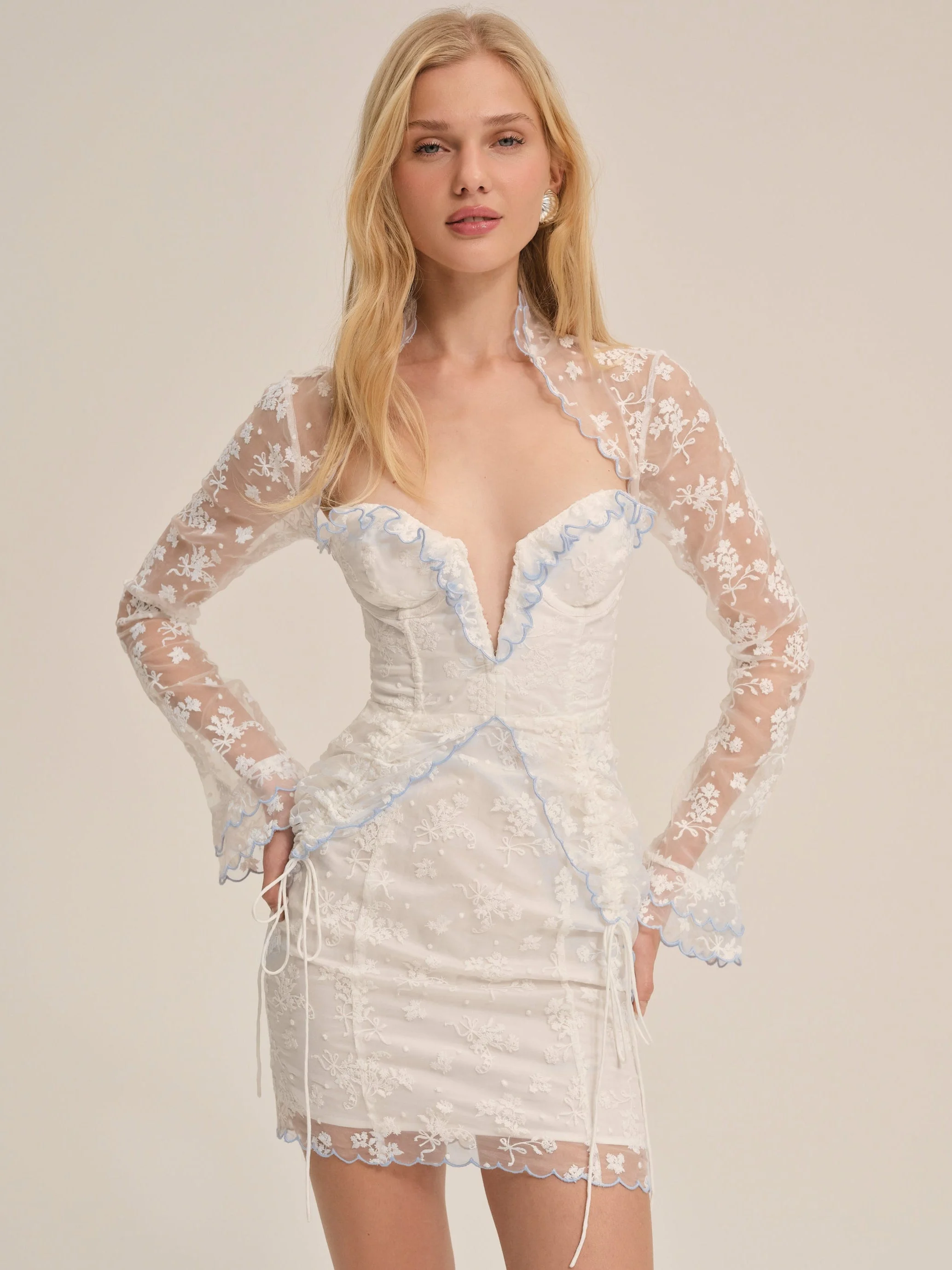 An intricate lace dress, the Bluebell white mini dress is craftted with a V-wire design at the center-front, a boned bodice, and gathered details with functional ties at the front hips. With a whimsical organza overlay and sheer lace sleeves, this short dress will enchant all summer long. Style Notes - Underwire - Ruffles throughout - Center-back invisible zip closure Fabric + Care - Crafted in 100% cotton - Contrast is made of 100% polyester - Dry clean only