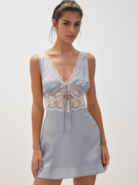 Designed for the Muse who loves to wear her lingerie out, the Bluebird blue slip dress with a plunging V-neckline is crafted in a timeless silky jacquard for a vintage aesthetic. This blue mini dress is adorned with pretty lace trims. Style Notes - Unlined - Flared skirt - Invisible zipper at center-back Fabric + Care - Crafted in 55% polyester, 45% viscose - Waist fabric is made of 100% recycled polyester - Hand wash cold - Only non-chlorine bleach - Do not wring or twist - Line dry - Do not iron - Do not dry clean