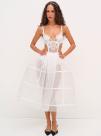 Designed for a picture perfect honeymoon, the Blushing Blooms midi slip dress exudes divine romance. Crafted in a sheer floral embroidered mesh and delicate tulle, this bridal slip dress spotlights floral embroidered underwire cups, a dramatic hoop skirt with tulle overlay, and an open-back. Style Notes - Satin half cup lining - Adjustable shoulder straps - Hook and eye closure at center back - Invisible zipper and left waist skirt side seam - Built-in satin panty lining (no snaps at gusset) Fabric + Care - Crafted in 100% polyamide - Lace is made of 100% polyamide - Embroidery is made of 100% polyester - Mesh is made of 88% polyamide, 12% elastane - Body lining is made of 100% polyester - Panty is made of 97% polyester, 3% elastane - Gusset is made of 100% modal - Hand wash cold - Do not wring or twist - Line dry - Do not iron - Do not dry clean