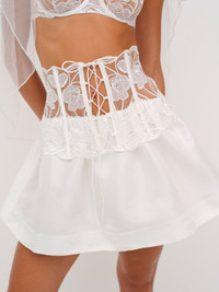 Designed for a picture perfect honeymoon, the Blushing Blooms satin mini skirt exudes divine romance. Crafted in a sleek satin, this white mini skirt is detailed with a corset-styled self-tying floral mesh waist cincher, gathered skirt, and includes a built-in stretch satin panty lining. Style Notes - Built-in stretch satin panty lining - No snaps at the gusset - Invisible zipper at left waist side seam - Decorative elastics as tapings on cincher Fabric + Care - Crafted in 100% polyamide - Embroidery is made of 100% polyester - Lower body is made of 64% polyester, 32% polyamide, 4% elastane - Panty is made of 97% polyester, 3% elastane - Gusset is made of 100% modal - Hand Wash Cold - Do not wring or twist - Line dry - Do not iron - Do not dry clean