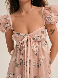 A romantic summer occasion dress—the Blushing Rose pink maxi dress is crafted in a floral-embroidered tulle. It features floral appliques, feminine puff sleeves, and an open back with tie detail. Style Notes - Fully lined - Semi-sheer - Elasticated waist Fabric + Care - Crafted in 100% polyester - Lining is made of 100% recycled polyester - Contrast is made of 100% recycled polyester - Dry clean only