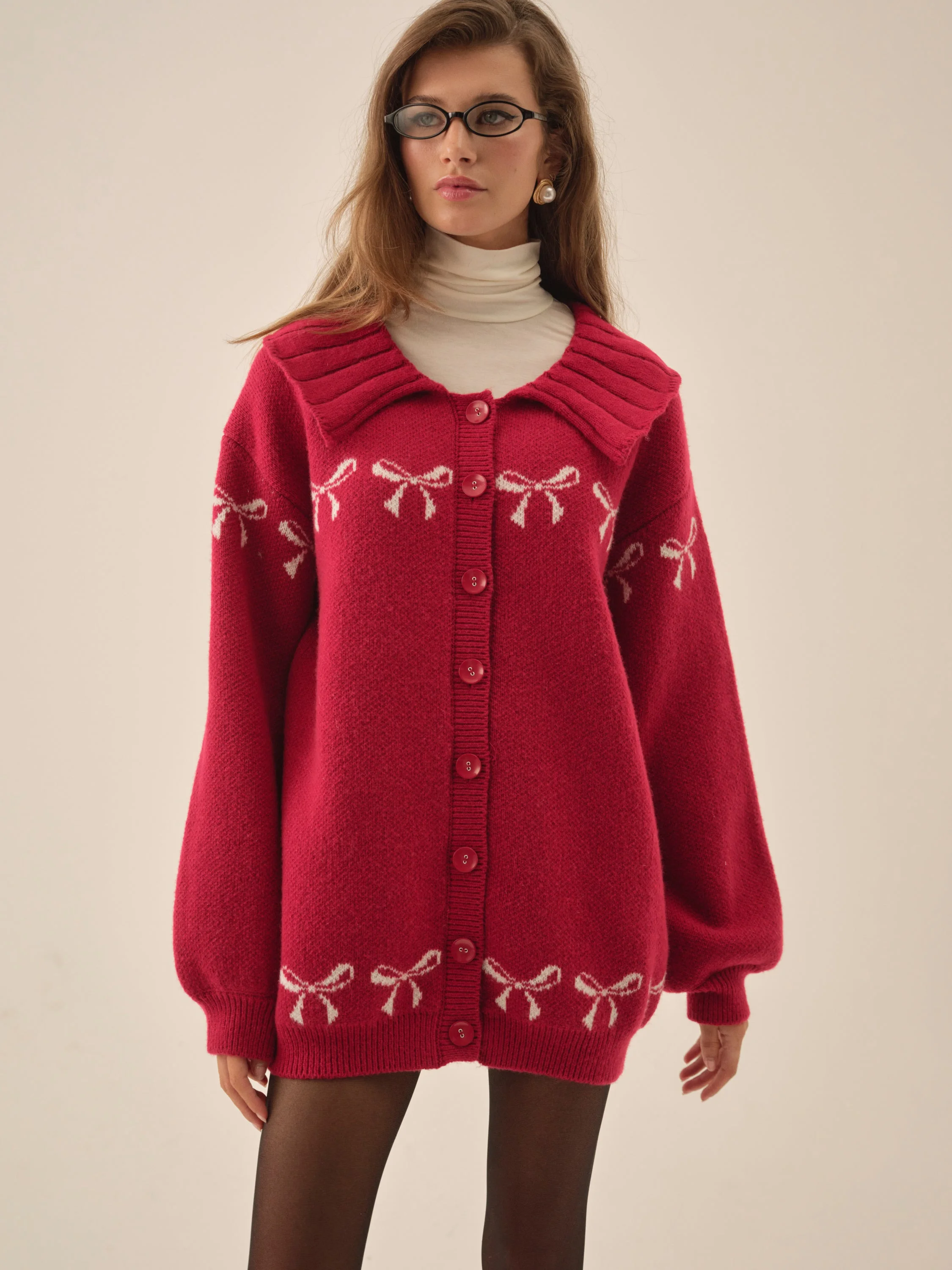 Designed for the modern romantic, the Bow red cardigan has a thoroughly festive feel with its bow intarsia pattern. Featuring a ribbed collar, cuffs, and billowy long sleeves, this oversized cardigan will keep you cozy during the crispest days. Fit Notes - Oversized Style Notes - Unlined - Functional button closures at the center-front Fabric + Care - Crafted in 100% polyester - Dry clean only
