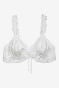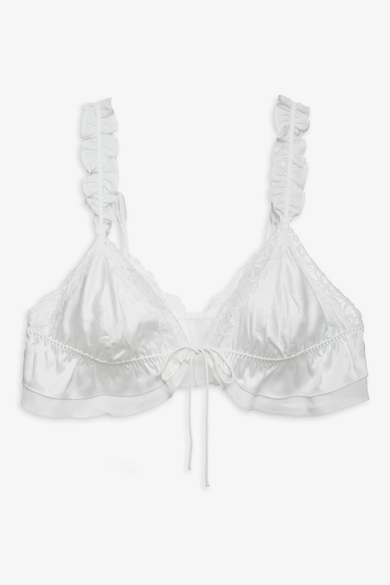 The Roccio white bralette is a dreamy bralette bra for those who like to keep love simple. With a lace trim, and ethereal satin and chiffon ruffles—this romantic and sexy lingerie will having you floating on cloud nine. Style Notes - Unlined - Wireless - Adjustable tie straps - Skinny tie at the front Fabric + Care - Crafted in 62% polyester, 33% recycled polyester, 5% elastane - Contrast 1 is made of 58% recycled polyamide, 42% polyamide - Contrast 2 is made of 100% recycled polyester - Wash separately - Machine wash cold - Tumble dry low - Do not iron - Do not dry clean