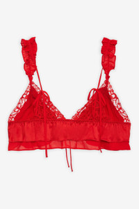 The Butterfly Lace Ruffle red bralette is an ultra-romantic bralette bra for those who like to keep love fun and flirty. With a lace trim, and ethereal satin and chiffon ruffles—this romantic and sexy lace bralette is cupid approved. Style Notes - Unlined - Wireless - Adjustable tie straps - Skinny tie at the front Fabric + Care - Crafted in 97% polyester, 3% elastane - Lace is made of 58% recycled polyamide 42% polyamide - Ruffles are made of 100% recycled polyester - Hand wash cold - Do not wring or twist - Line dry - Do not iron - Do not dry clean