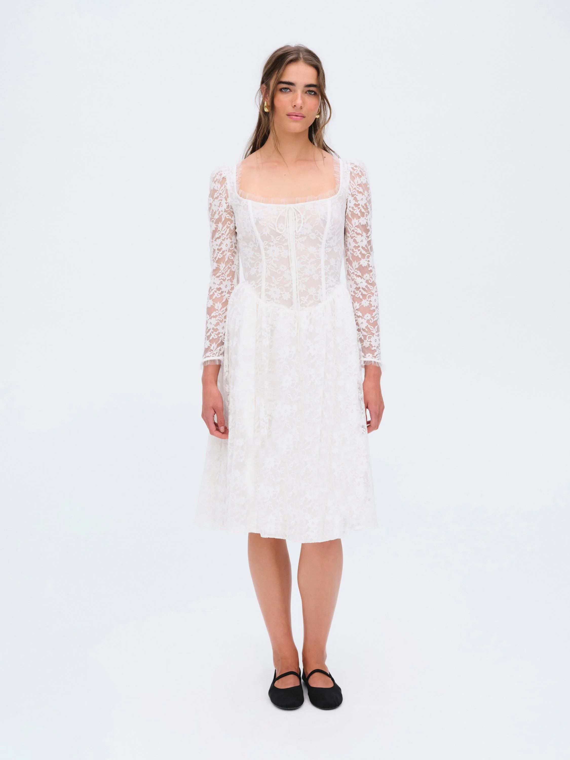 Introducing the Camdyn white midi dress, crafted in elegant lace for timeless appeal. Featuring a wide scoop neckline, this lace dress is adorned with delicate lace ruffles, boning at the bodice, and three-quarter exposed lace sleeves.