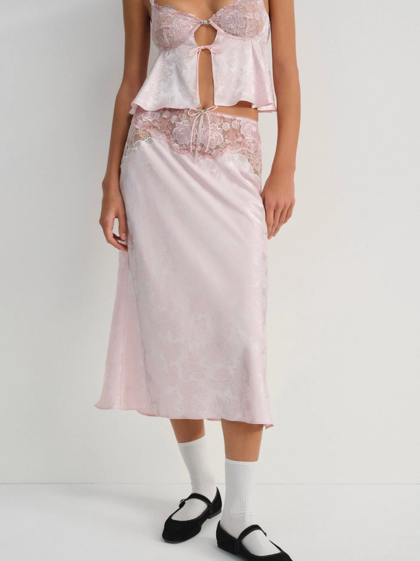 Designed for slow mornings and sultry nights, the Camilla satin midi skirt was made to be seen. Crafted in a sleek floral jacquard, this pink midi skirt is adorned with intricate floral embroidery at the waist and a decorative rosette topped bow. Pair it with the Camilla Sleep Top for a matching co-ord set. Style Notes - Unlined - Invisible zipper at left side seam Fabric + Care - Crafted in 97% polyester, 3% elastane - Side panel lace is made of 100% polyamide - Center front lace is made of 100% polyester - Hand wash cold - Only non-chlorine bleach - Do not wring or twist - Line dry - Do not iron - Do not dry clean