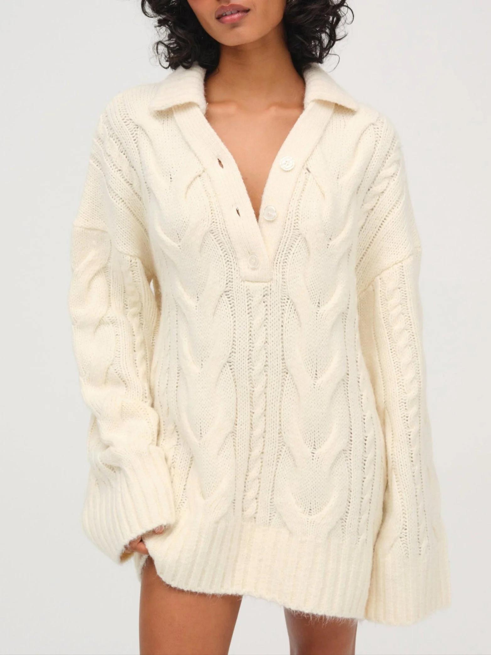Inspired by the demure aesthetics of the ‘50s and ‘60s, the Camille cable knit sweater offers transitional springtime ease. Crafted in a chunky cable knit, this pull-on oversized sweater features cozy wide flared sleeves, a functional henley neck placket, and classic rib knit trims at the neck, hem, and cuffs. Style Notes - Unlined - Functional buttons at the center-front Fabric + Care - Crafted in 77% acrylic, 9% nylon, 8% wool, 6% polyester - Dry clean only