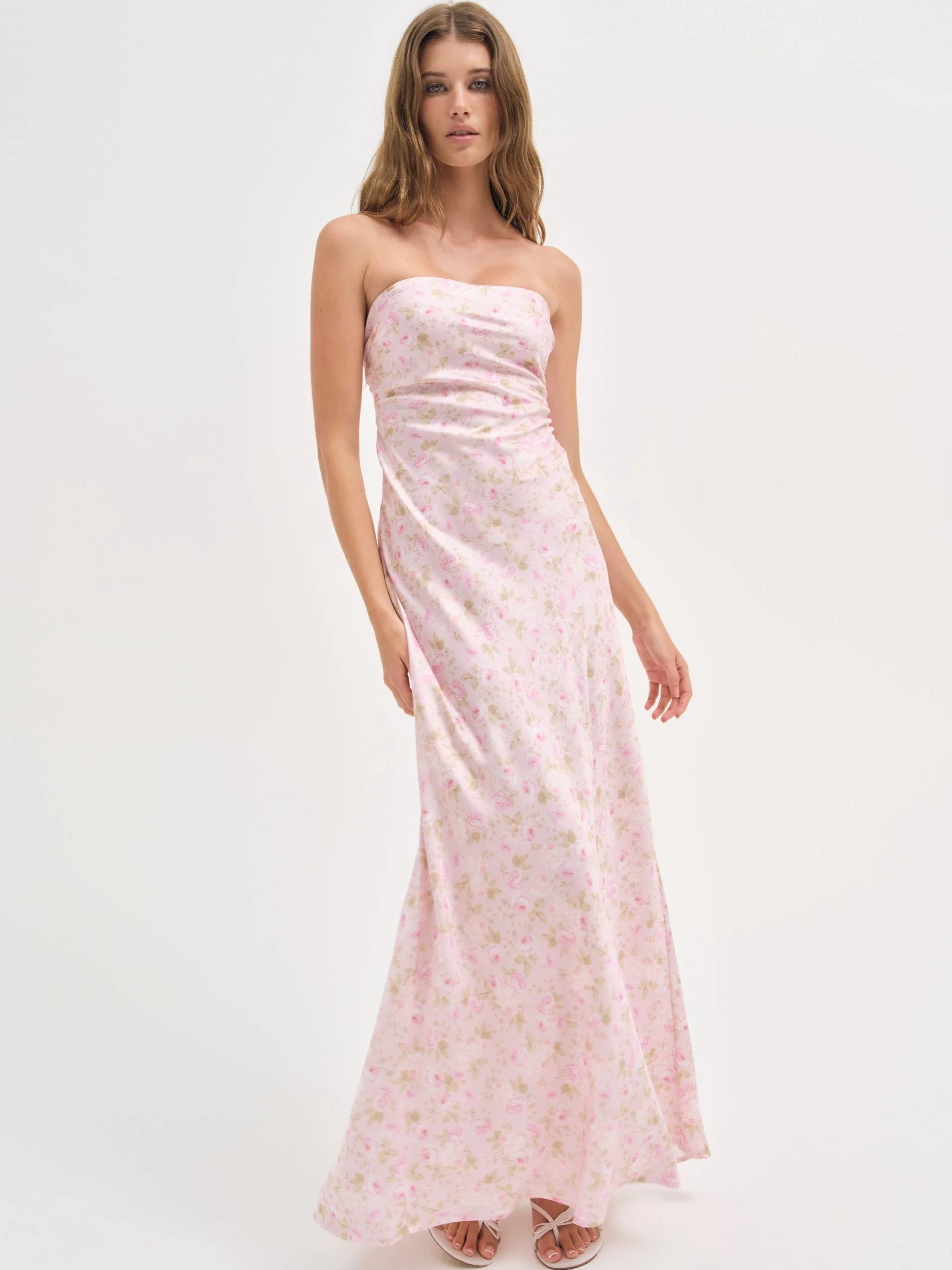 Radiate summer elegance in the Carla strapless long dress, featured in an all-over floral print. This pink maxi dress skims and elongates the body with its flattering column silhouette, making it perfect for summer soirees. Fit Notes - True to size - Relaxed fit Style Notes - Fully lined - Invisible zipper at center-back Fabric + Care - Crafted in 100% polyester - Lining is made of 90% polyester, 10% spandex - Eco dry clean is recommended to avoid harmful chemicals like "perc".