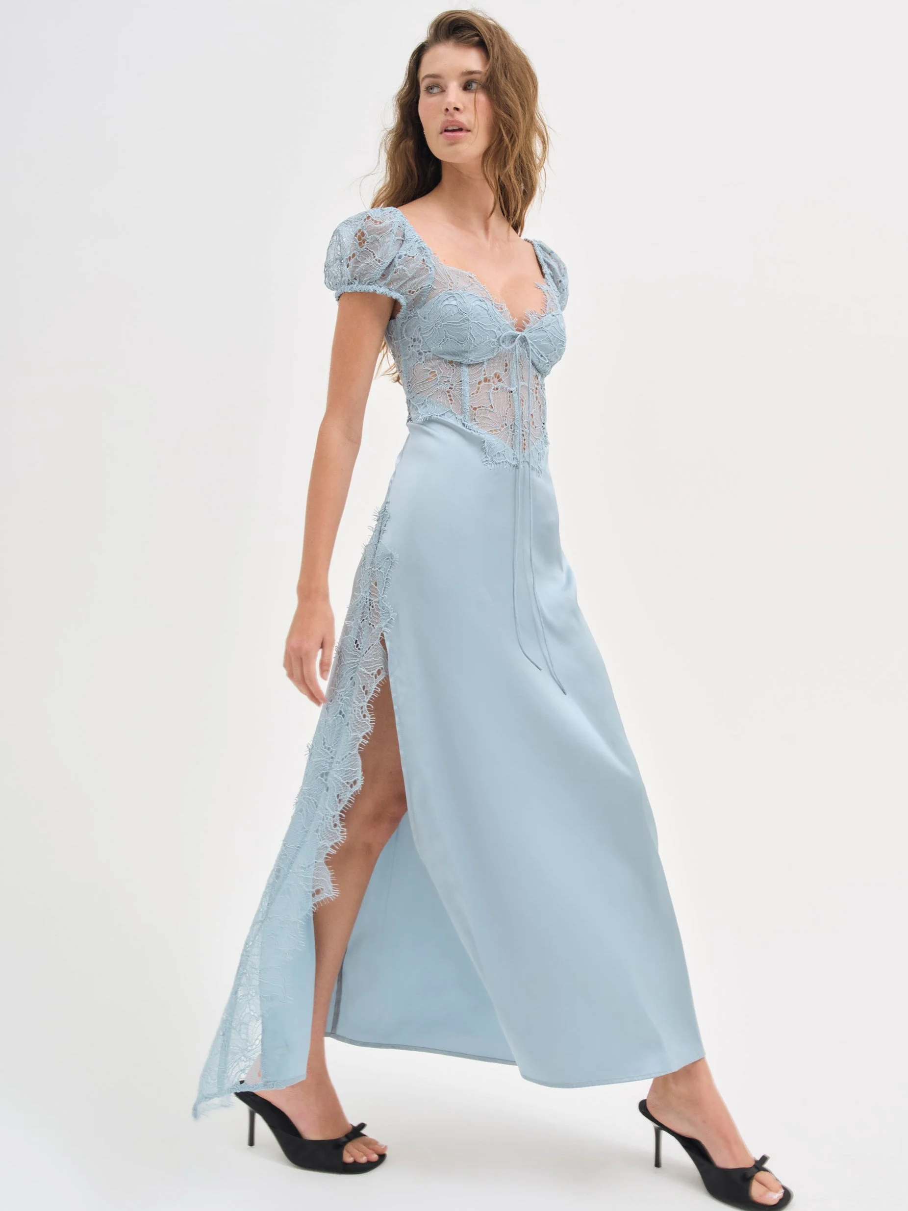 The perfect blue dress doesn't exist–that was true, until the Casey Maxi Dress came along. Designed with puff sleeves, this blue cocktail dress features a romantic scalloped lace V-neck bodice with a sweeping satin skirt—it also pairs well with champagne, making it the perfect wedding guest dress. Style Notes - Lined cups - Sheer lace bodice - Contoured waist with boning - Thigh-high slit - Center-back invisible zipper Fabric + Care - Crafted in 100% polyester - Lining is made of 97% recycled polyester, 3% spandex - Eco dry clean recommended to avoid cleaners that use harmful chemicals like "perc".