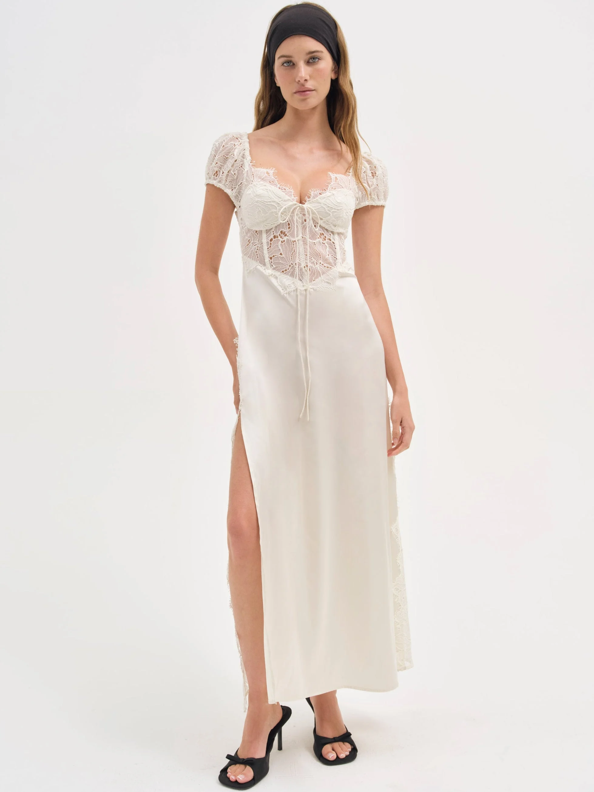 The perfect white dress doesn't exist–that was true, until the Casey Maxi Dress came along. Designed with puff sleeves, this white cocktail dress features a romantic scalloped lace V-neck bodice with a sweeping satin skirt—it also pairs well with champagne, making it the perfect maxi for your next soiree. Style Notes - Lined cups - Sheer lace bodice - Contoured waist with boning - Thigh-high slit - Center-back invisible zipper Fabric + Care - Crafted in 100% polyester - Lining is made of 97% recycled polyester, 3% spandex - Eco dry clean recommended to avoid cleaners that use harmful chemicals like "perc".