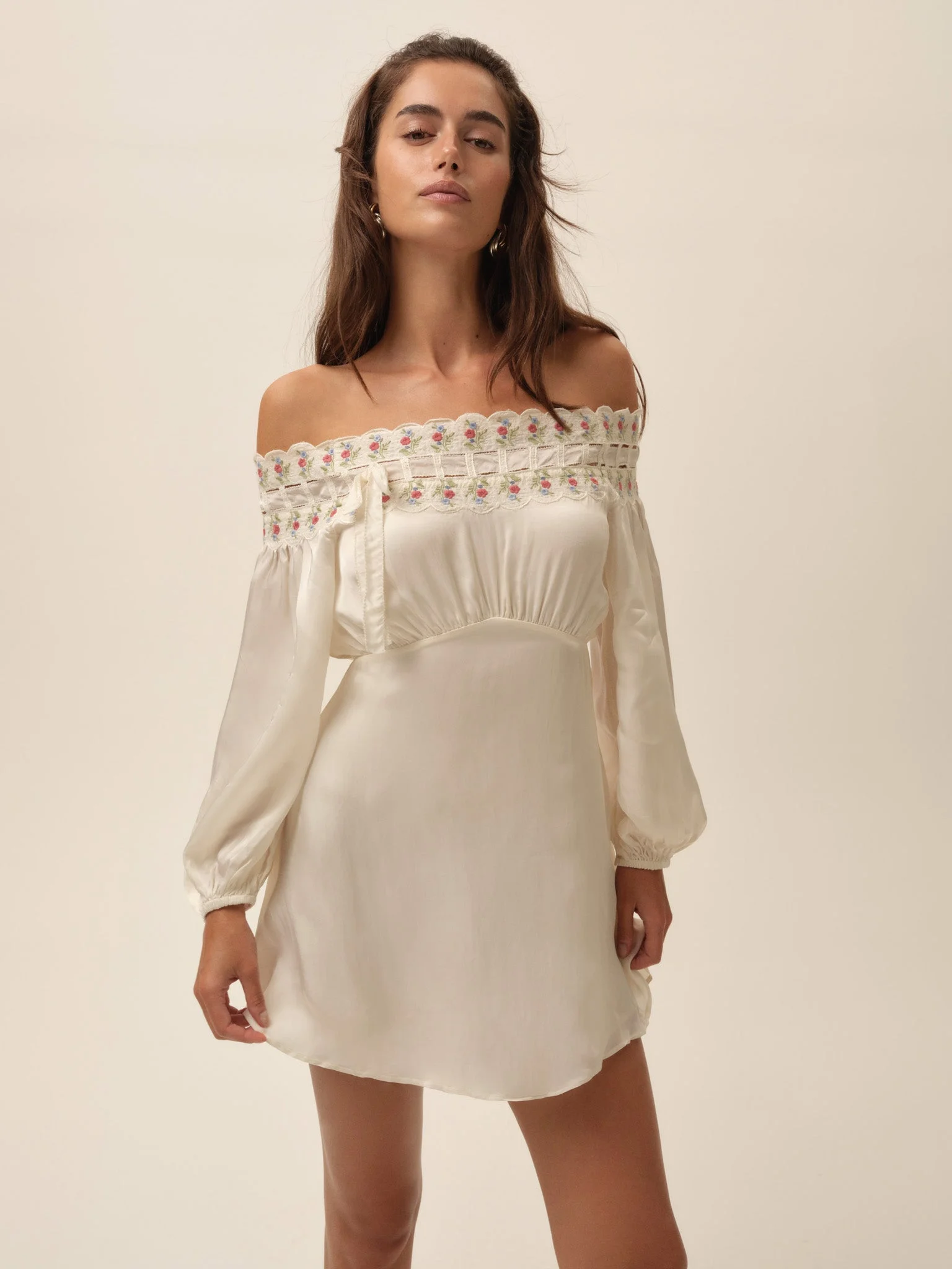 Bare shoulders, long billowy sleeves, and a soft A-line skirt define this romantic mini dress, finished with floral embroidery at the neckline for an easy garden-country feel. Style Notes - Slotted embroidery trim - Functional tie woven through trim at neckline - Curved waist seam with shirring - Long billowy elasticized sleeves - A-line skirt - Fully lined Fabric + Care - Crafted in 100% polyester - Lining is made of 100% polyester - Dry clean only