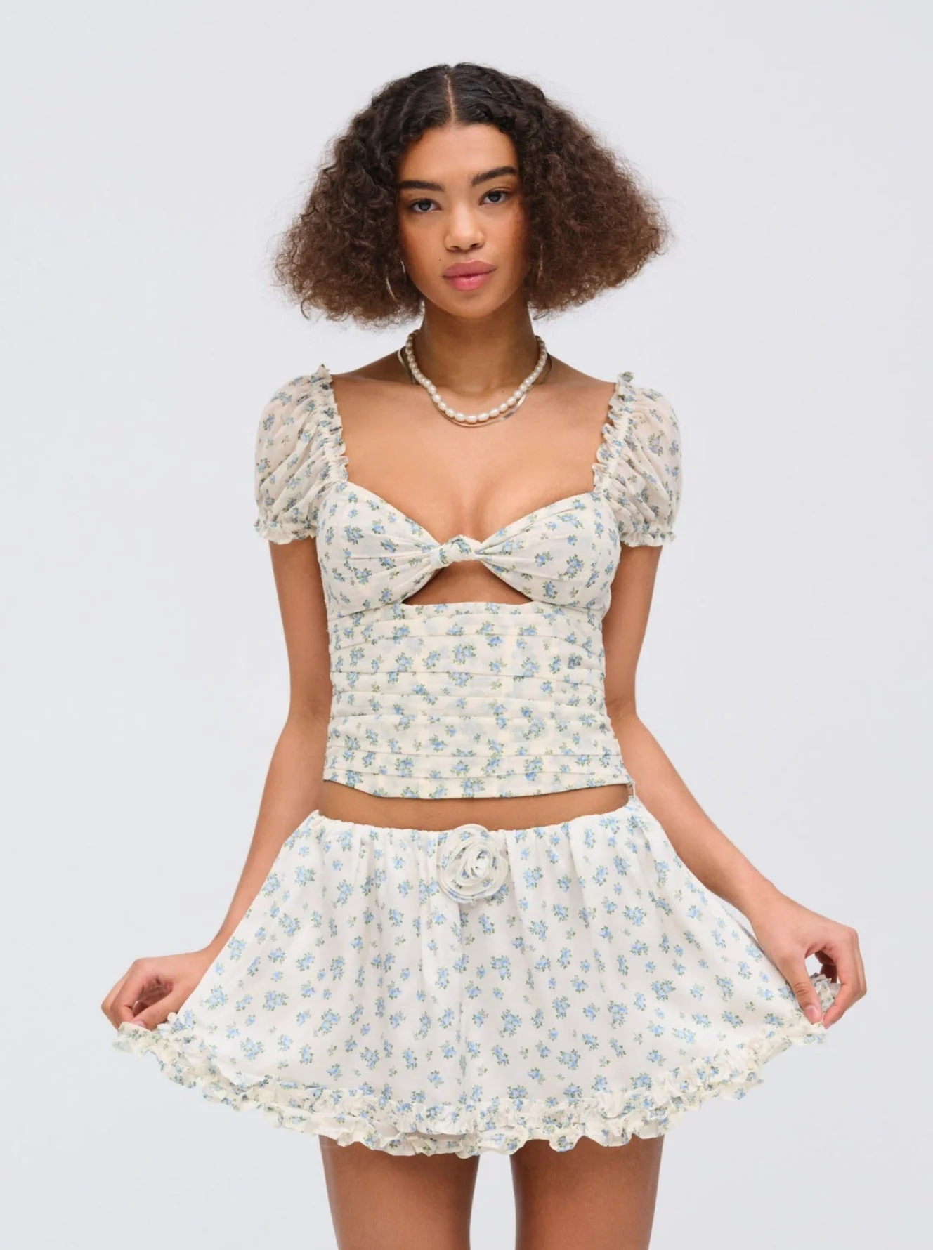Become a spectacle of whimsicality in the Chateau blue mini skirt—crafted in a silky satin with an all-over pastel blue floral print. Featuring extra volume, this full circle skirt is finished with contrast ruffles and a fixed rosette for a feminine aesthetic. Pair it with the matching Chateau Top for the complete skirt set. Fit NotesThe Chateau Mini Skirt is true to size and designed to sit low on the waist. For a more high-waisted fit, we recommend you taking the next size down. Style Notes - Fully lined - Invisible zipper at the side seam Fabric + Care - Crafted in 56% ecovera viscose™ - Lining is made of 100% recycled polyester - Eco dry clean recommended