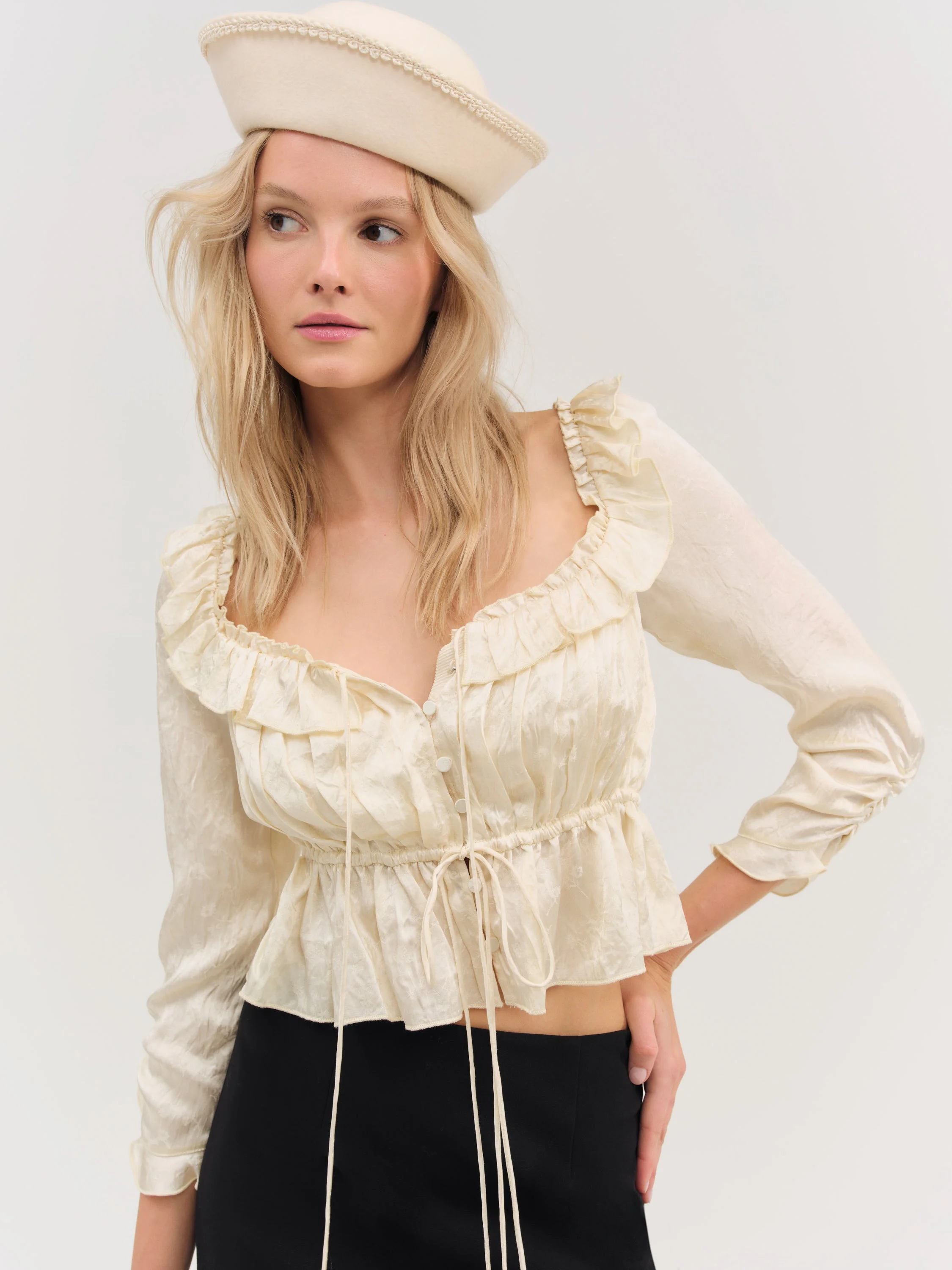 For late summer and the early days of fall, the Clarissa cropped long sleeve top charms with its vintage-inspired gathered bodice, ruffled trims, and 3/4 length sleeves. Fit Notes - True to size Style Notes - Functional button placket closure - Adjustable waist with drawstring Fabric + Care - Crafted in 100% acetate - Dry clean only