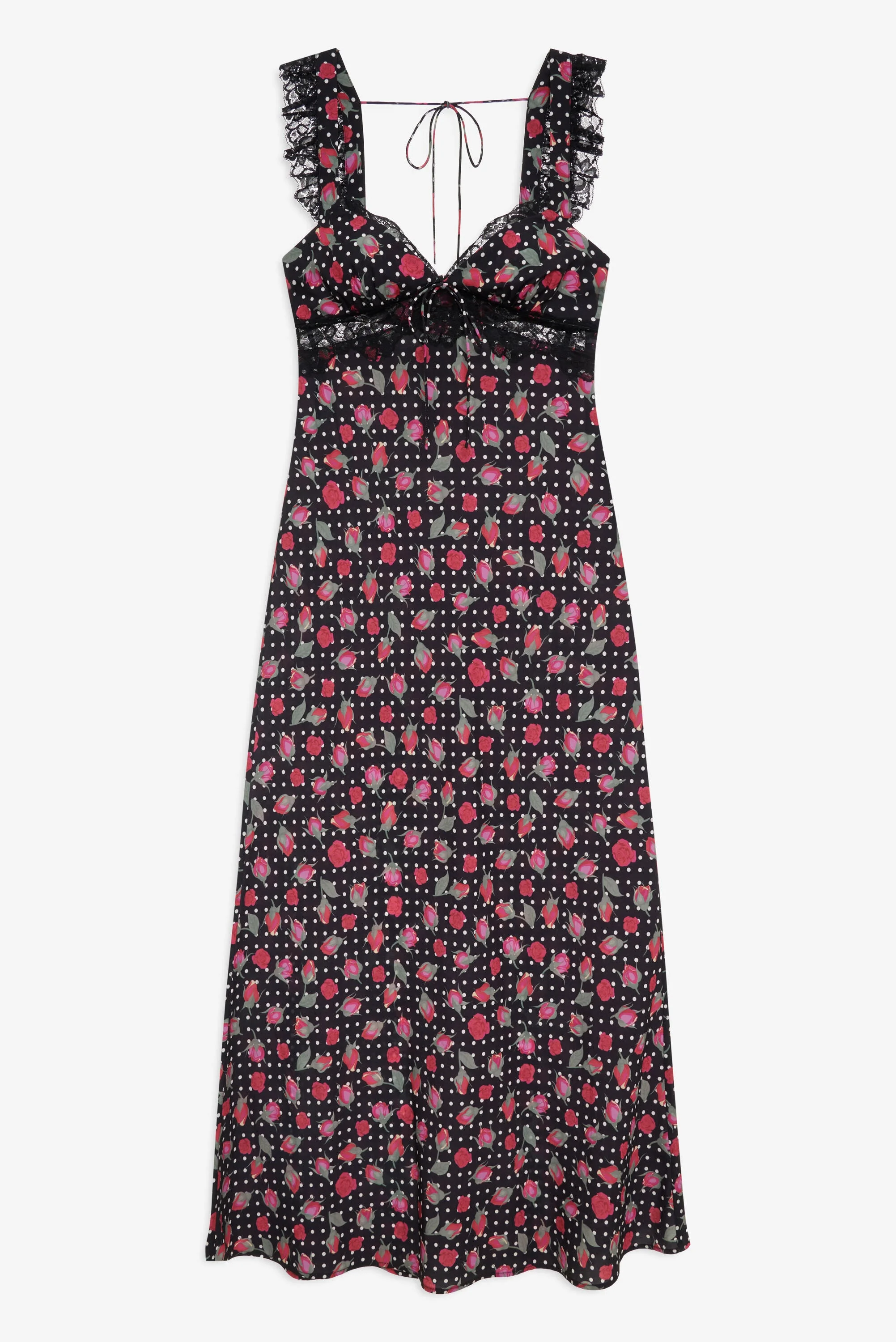 Romanticize the in-between moments of a slower season with the Clarisse black maxi dress—a floral maxi dress crafted a romantic red rose and polka dot print. This bias-cut maxi dress features a “v” neckline, flutter sleeves, and is adorned with lace trims throughout. Fit Notes - True to size Style Notes - Cup lining only - Functional back shoulder tie - Invisible zipper at left waist side seam Fabric + Care - Crafted in 100% polyester - Lining is made of 100% recycled polyester - Dry clean only