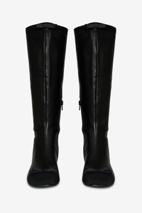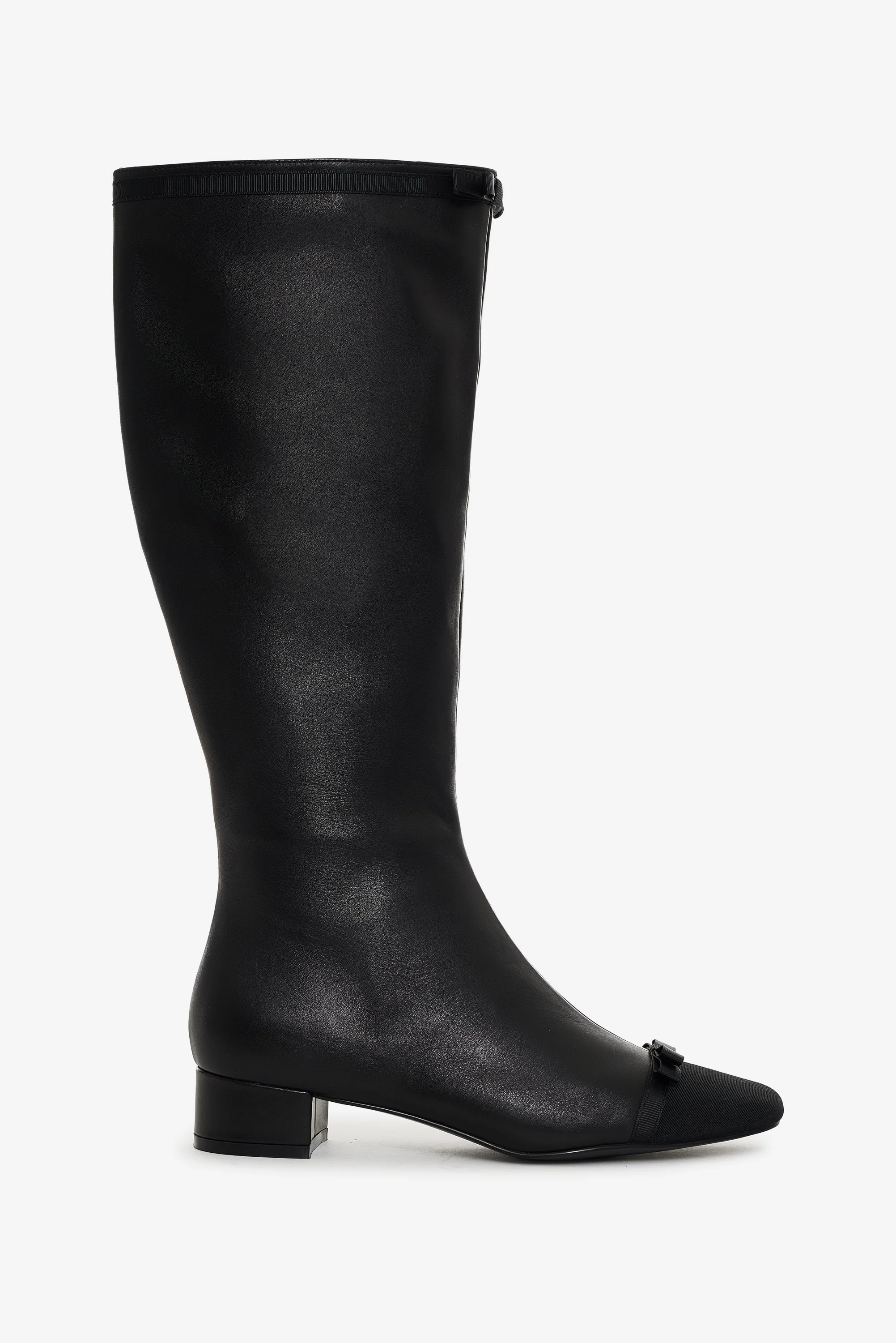 An homage to '60s footwear—the Claudine Cap Toe tall black boots are as chic as they are wearable. Featuring decorative grosgrain ribbon straps at the front and toe, these knee high leather boots are destined to become a seasonal staple. Style Notes - Heel height: 34mm Fabric + Care - Leather/Grossgrain - Tonal Grossgrain Ribbon - Heel Height: 34 mm
