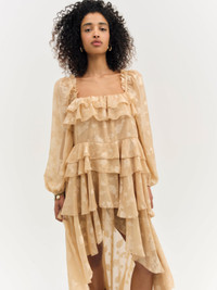 Cut to an antique-inspired silhouette, the Colette Satin ruffled maxi dress was made for the vintage-loving Muse. Crafted in a sheer satin burnout chiffon, this long sleeve maxi dress features elasticated shoulders and neckline, a hi-low skirt hem, and billowy long sleeves. Style Notes - Lined through mini skirt length Fabric + Care - Crafted in 100% polyester - Lining is made of 100% polyester - Dry clean only