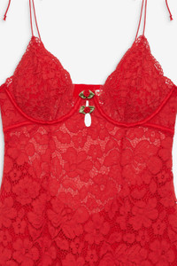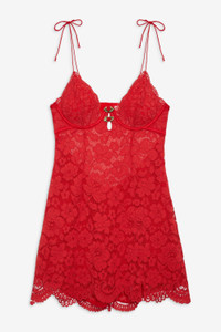 This red Creamsicle slip dress serves up romantic, with scalloped lace combined with ultra-skinny tie straps and rosette accents. What makes this dress not so girl-next-door are its mini length, saucy slit, and built-in underwire bra with a cutout back. Style Notes - Underwire - Tie straps - Open back - Side slit - Hits at mid thigh - Hook & eye closure - Partially made from recycled materials - Imported Fabric + Care - Crafted in 100% polyester - Hand wash separately - Air dry with care