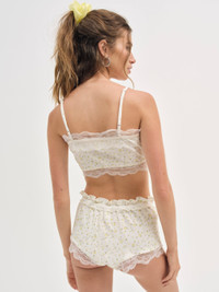 A whimsical ode to the sweet and simple life, the Dahlia sleep bralette exudes delicate spring charm. Crafted in a bandeau silhouette, this bluecrop top is adorned with dainty lace trims and a rosette topped bow for a feminine touch. Style Notes - Adjustable shoulder straps Fabric + Care - Crafted in 80% polyester, 16% viscose, 4% elastane - Lace is made of 91% polyamide, 9% elastane - Hand wash cold - Only non-chlorine bleach - Do not wring or twist - Line dry - Do not iron - Do not dry clean
