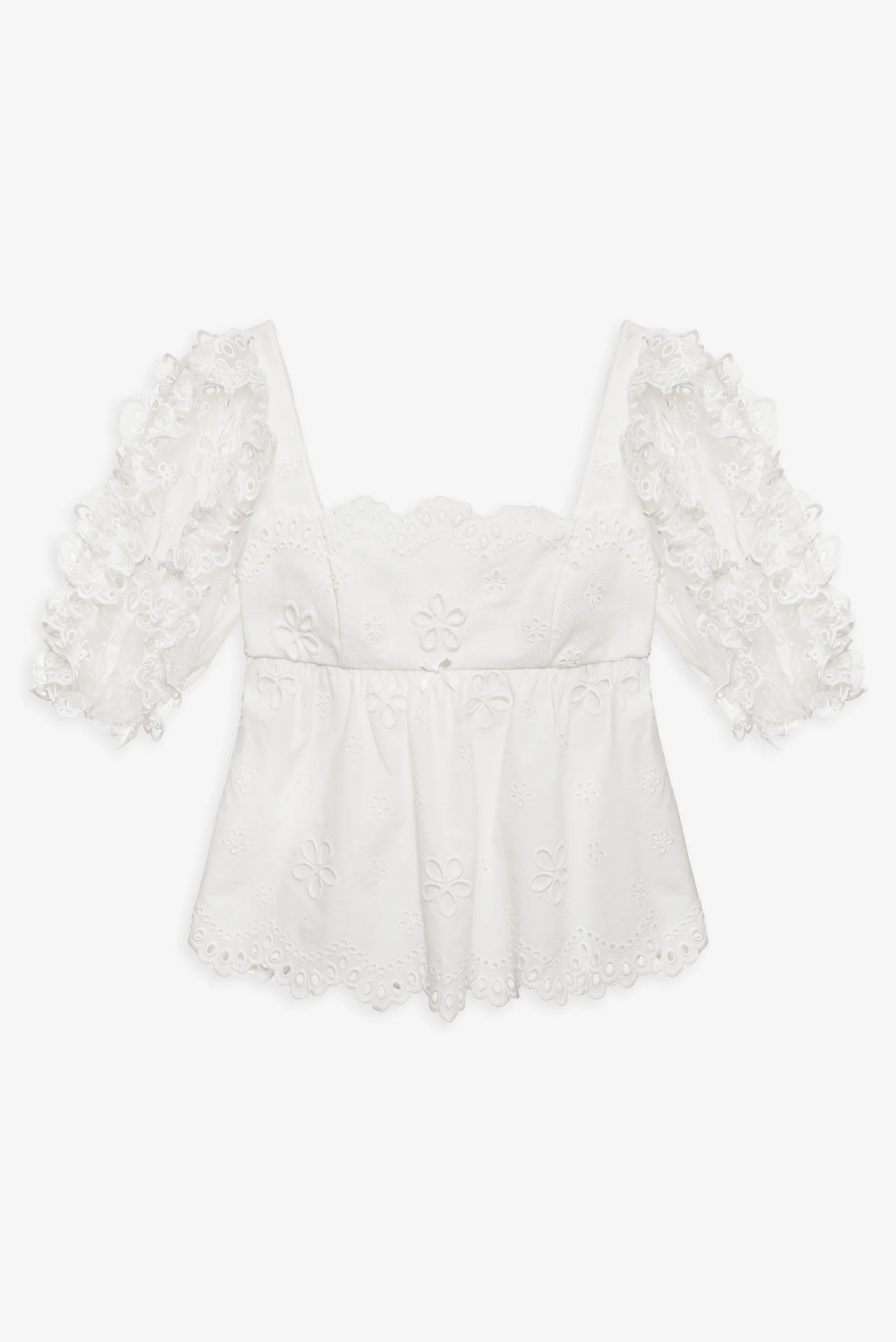 An ultra-feminine babydoll top for springtime strolls, the Daisy eyelet top is crafted in a crisp daisy eyelet on denim. This white top spotlights a chic scalloped squared neckline, sheer elasticized organza eyelet puff elbow length sleeves, and an open back. Pair with Daisy Eyelet Denim Skort for a complete co-ord set. Style Notes - Fully lined body - No sleeve lining - Elastic at center-back - Adjustable swan hook and eye closure at center-back Fabric + Care - Crafted in 100% cotton - Contrast is made of 100% polyester - Lining is made of 100% cotton - Dry clean only