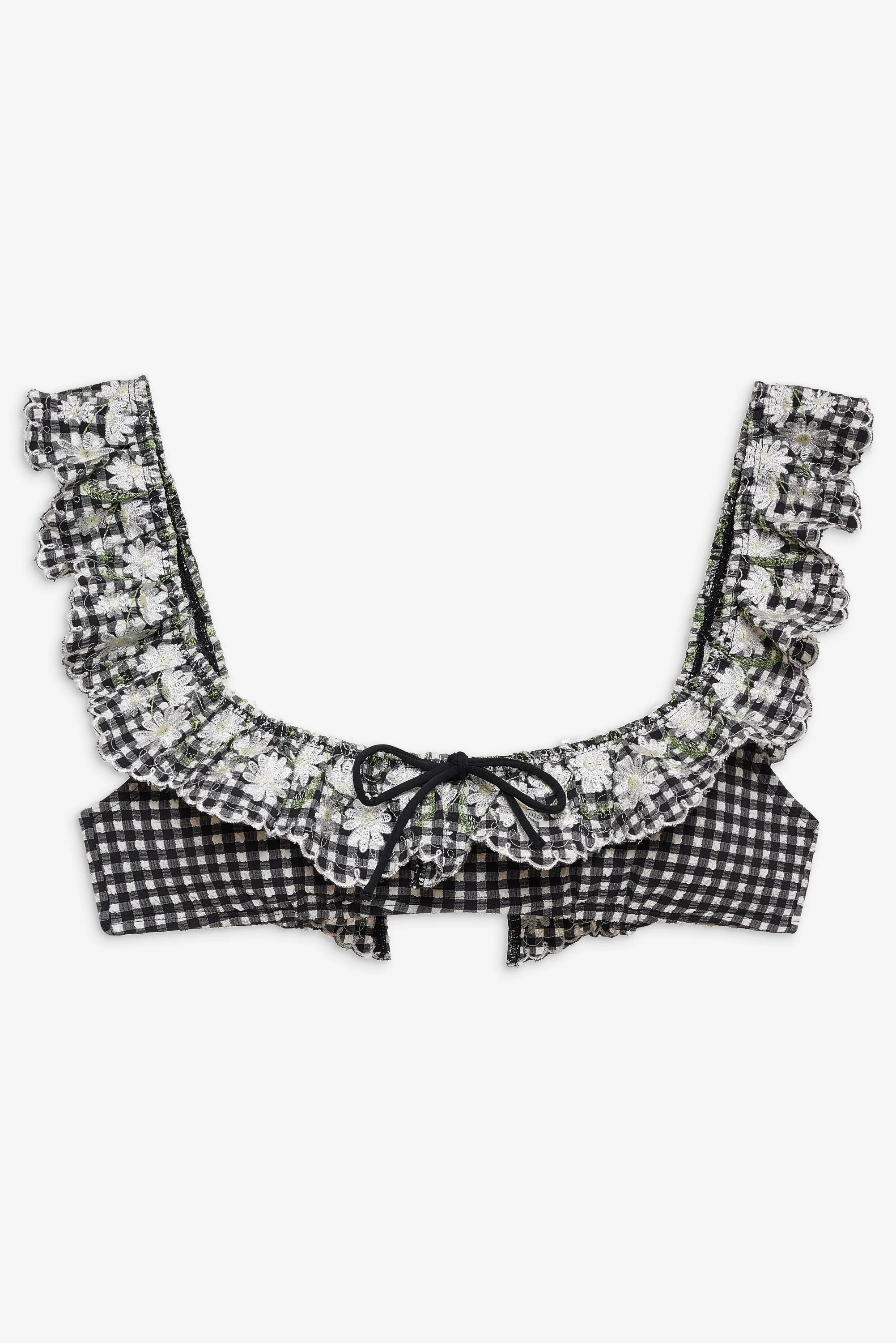 Become a retro Muse in the vintage-inspired Daisy Lane black bikini top. Crafted in a charming black and white gingham, this ruffled bikini top features a scoop neckline, ruffled lace trim, and a center-front bow. Pair it with the Daisy Lane Bikini Bottom for the full bikini set. Style Notes - Fully lined - Elasticized neckline and underbust - Adjustable swan hook closure at center back Fabric + Care - Crafted in 80% nylon, 20% spandex - Embroidery is made of 100% polyester - Lining is made of 90% nylon, 10% spandex - Hand wash cold - Drip dry in the shade - Do not tumble dry - Do not iron - Do not dry clean