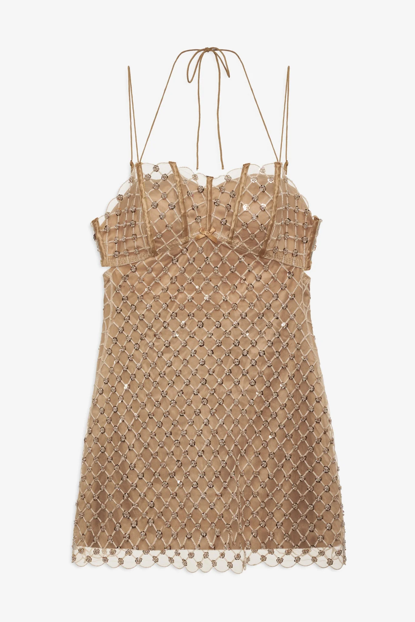 Glisten through the night with the Dazzle Me sequin mini dress—a gold slip dress that captivates and charms with sparkling sequins throughout. Crafted with a fully boned bust and a low open back, this gold mini dress is sure to captivate. Style Notes - Fully lined - Back waist keyhole with tie - Adjustable shoulder straps - Functional ties at back - Swan hook and eye closure at back Fabric + Care - Crafted in 100% polyamide - Embroidery is made of 100% polyester - Lining is made of 60% polyester, 33% recycled polyester, 7% elastane - Hand wash cold - Only non-chlorine bleach - Do not wring or twist - Line dry - Do not iron - Do not dry clean