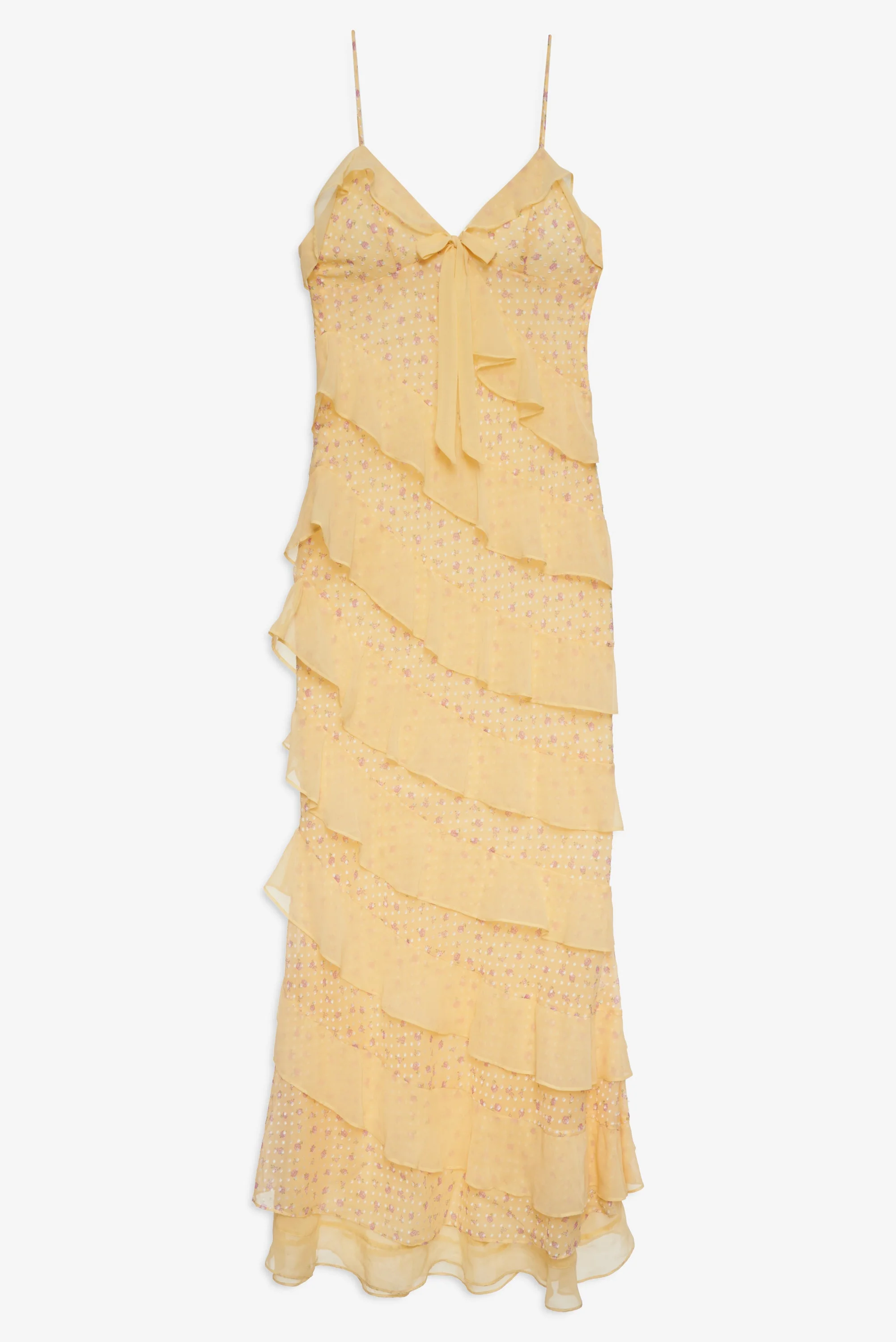 Become the picture of summer elegance in the Debby yellow maxi dress—a sweeping summer gown crafted in a floral dot burnout fabric, featuring a chiffon flounced neckline, angled tiered ruffles, and a mermaid skirt. It's perfect as a wedding guest dress or formal dress for summer soirees. Style Notes - Fully lined - Adjustable straps - Decorative chiffon bow at the center-front - Invisible zipper at the side seam Fabric + Care - Crafted in 75% rayon, 25% nylon - Lining is made of 100% polyester - Contrast is made of 100% polyester - Dry clean only