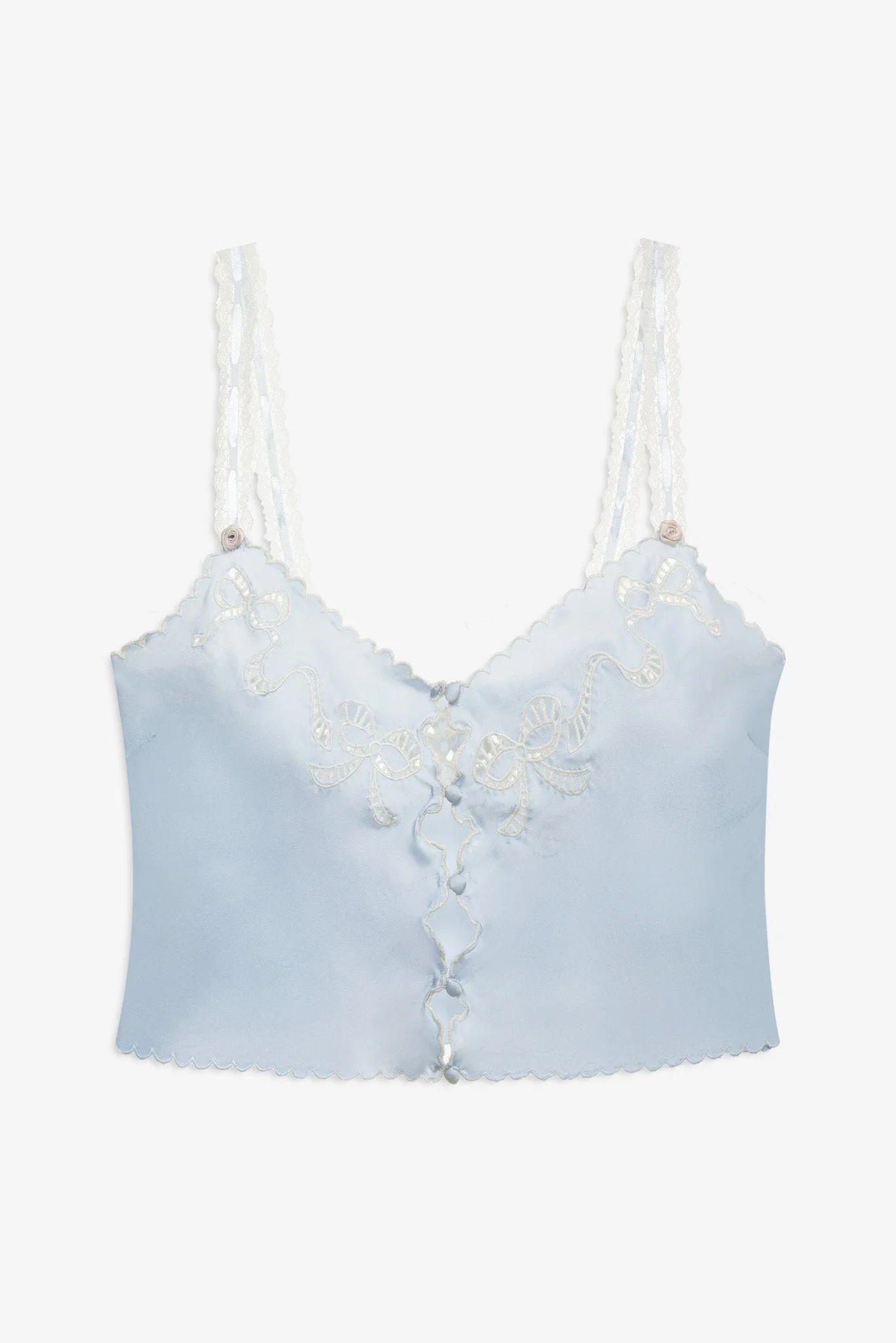 The Delaine satin sleep top features a triangle bralette shape adorned with bow detailing and embroidered scalloped edges. Light and easy to wear, it’s a bridal morning and peaceful night essential. Complete the look with the Delaine Sleep Short. Style Notes - Embroidered scallop edges - Bow motif on neckline - Functional center front covered buttons - Slotted ribbon trim shoulder straps - Unlined Fabric + Care - Crafted in 100% polyester - Machine wash cold - Lay flat to dry - Cool iron ok - Ok to dry clean
