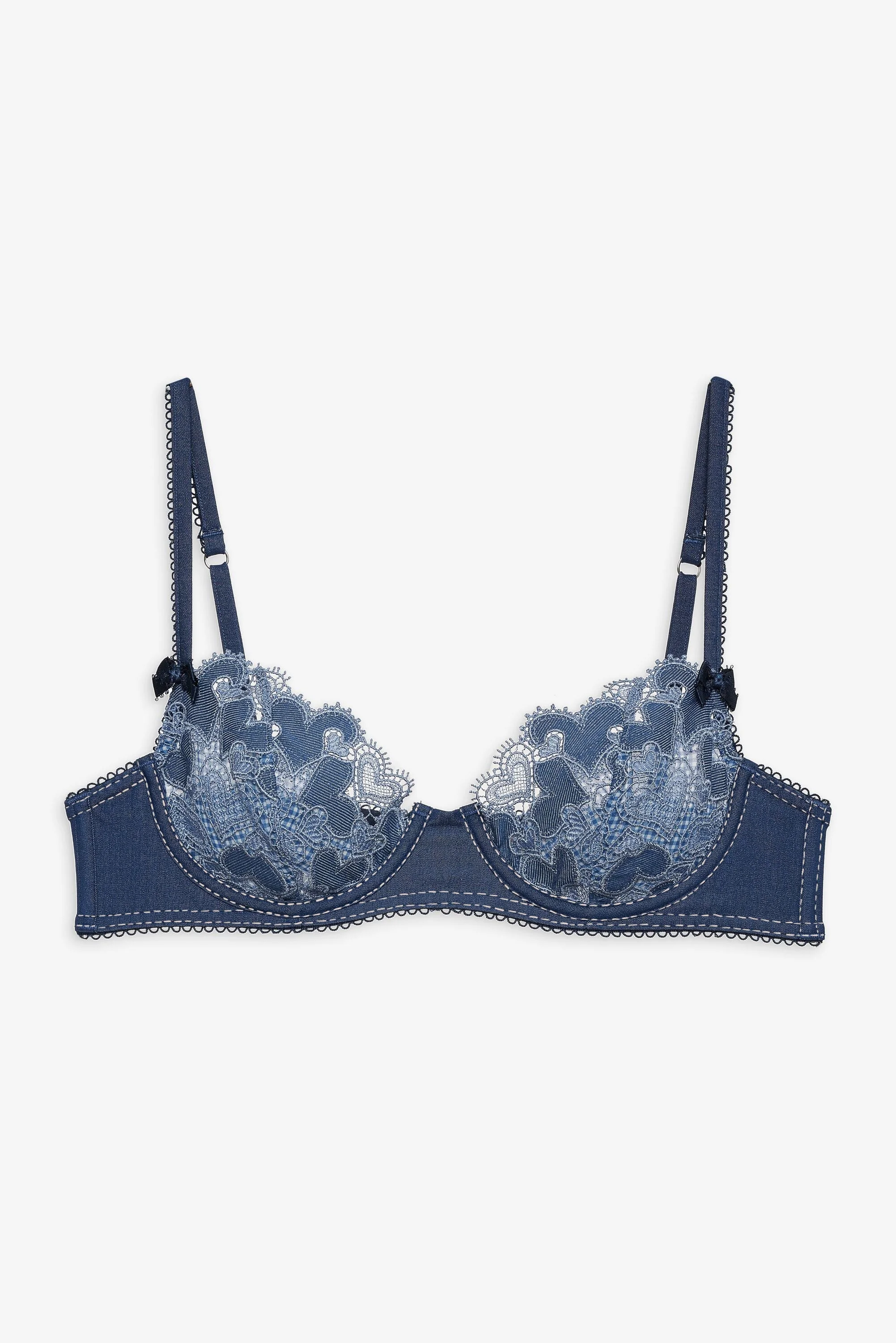 Designed for slow desert days and party-filled nights, the Denim Hearts blue underwire bra is crafted in a solid denim with contrasting heart-embroidered gingham that exudes festival charm. Featuring sweet bow appliques and a dainty picot trim throughout—this denim bra is festival-ready. Style Notes - Unlined - Adjustable shoulder straps - Hook and eye closure at center-back Fabric + Care - Crafted in 70% polyester, 26% viscose, 4% elastane - Lace is made of 100% polyamide - Embroidery is made of 100% polyester - Hand wash cold - Line dry - Do not dry clean