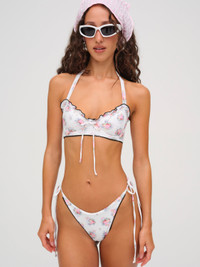 Designed for the sun-drenched Muse–the Doily underwire bikini top is rendered in a charming doily floral bouquet print and adorned with contrast trim ruffles. Inspired by retro swimwear, this halter bikini top features a functional center back tie and a center-front bow that exudes vintage feminine charm. Style Notes - Fully lined - Scallop trim edge - Fixed center tie - Adjustable swan hook closure at center back Fabric + Care - Crafted in 80% recycled nylon, 20% spandex - Lining is made of 80% recycled nylon, 20% spandex - Hand wash cold - Drip dry in shade - Do not tumble dry - Do not iron - Do not dry clean