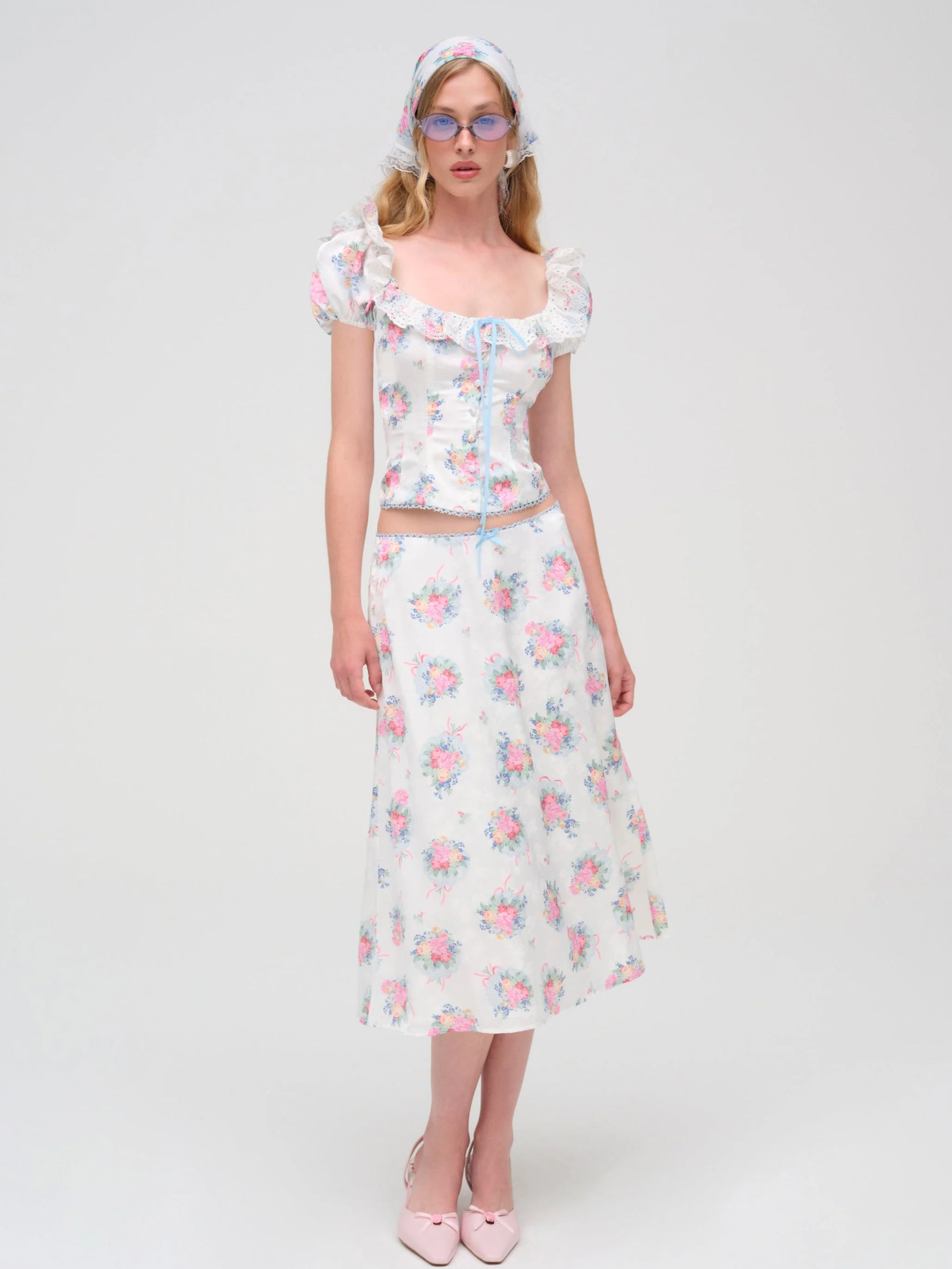 An ode to effortless romance and elegant femininity–the Doily Bouquet floral midi skirt is crafted in a sweet floral print. This flattering A-line midi skirt is adorned with a sweet picot elastic waistband and a center-front bow applique for a charming finish. Style Notes - Fully lined - Invisible zipper at left waist Fabric + Care - Lining is made of 98% recycled polyester, 2% spandex - Dry clean only