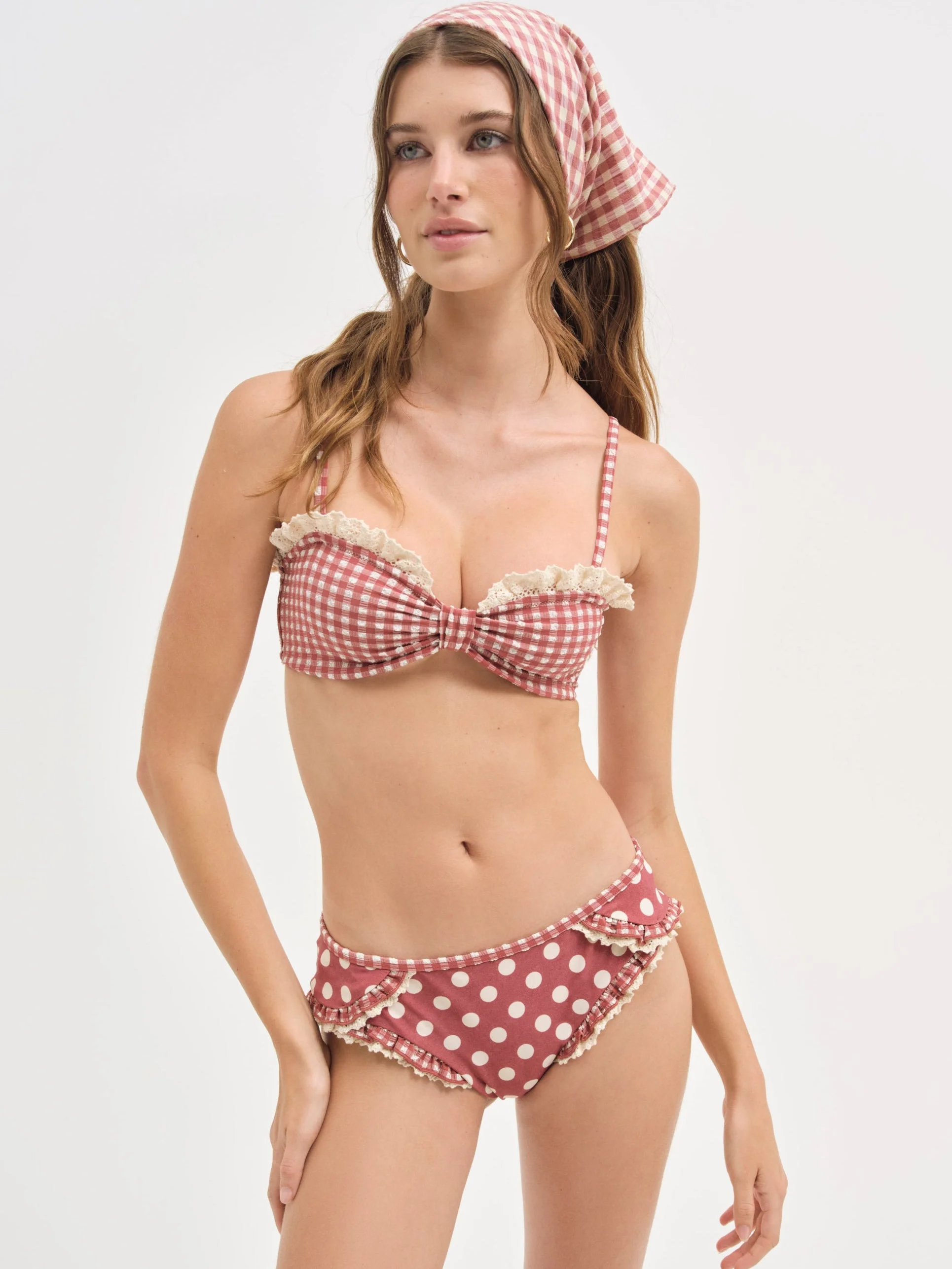 Inspired by vintage swimwear–the Dolly Dot red bikini bottom is rendered in a retro polka dot print and adorned with ruffled crochet lace trim. Cut to a high-rise, this cheeky thong bikini bottom offers medium coverage and maximum charm. Pair it with the Gingham Bandeau Bikini Top for the full bikini set. Style Notes - Fully lined - Cheeky thong coverage Fabric + Care - Crafted in 80% nylon, 20% spandex - Lining is made of 90% nylon, 10% spandex - Hand wash cold - Drip dry in shade - Do not tumble dry - Do not iron - Do not dry clean