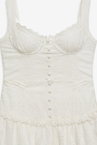 The Dreamy Daisy Mini Dress is what summer dreams are made of. Crafted in 100% cotton, this white eyelet dress exudes romance with its underwire cups, drop waist silhouette, and contrast eyelet trims. Style Notes - Fully lined - Functional adjustable shoulder straps that tie a t the back - Invisible zipper at the center-back - Non-functional button details at the placket Fabric + Care - Crafted in 100% cotton - Lining is made of 100% cotton - Machine wash cold - Lay flat to dry - Cool iron ok - Ok to dry clean