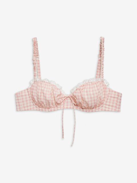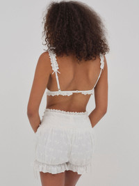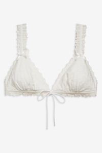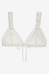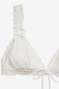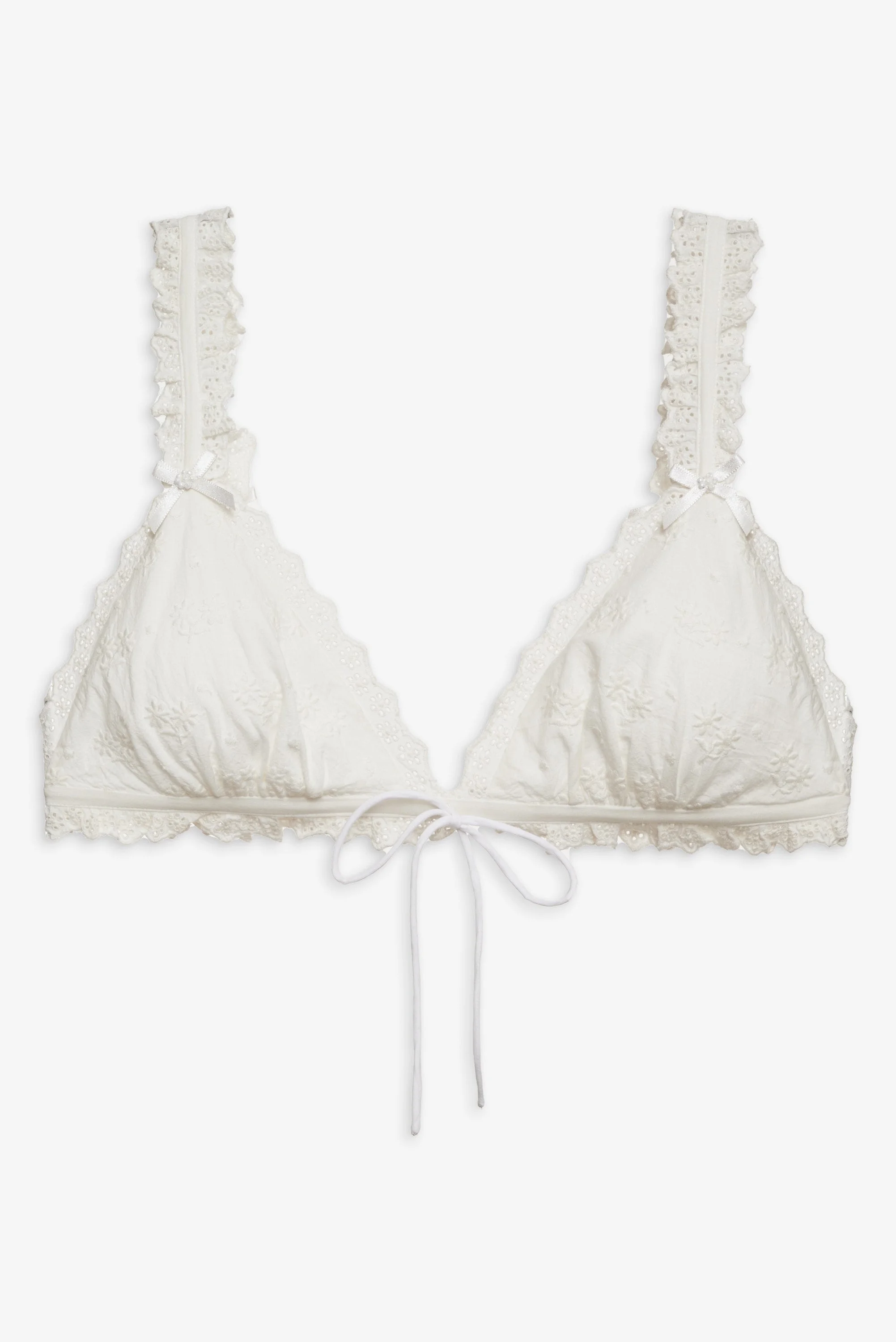 Go from sun-drenched mornings to balmy nights in the ultra-feminine Edie Eyelet white bralette, featuring triangle cups with spot ruching and ruffle eyelet trims. This triangle bra is adorned with a skinny lingerie bow and pearl flower detail—pair it with the matching Edie Eyelet Panty. Style Notes - Lined cups - Adjustable shoulder straps - Swan hook back closure Fabric + Care - Crafted in 100% cotton - Lining is made of 100% cotton - Machine wash cold - Lay flat to dry - Cool iron ok - Ok to dry clean