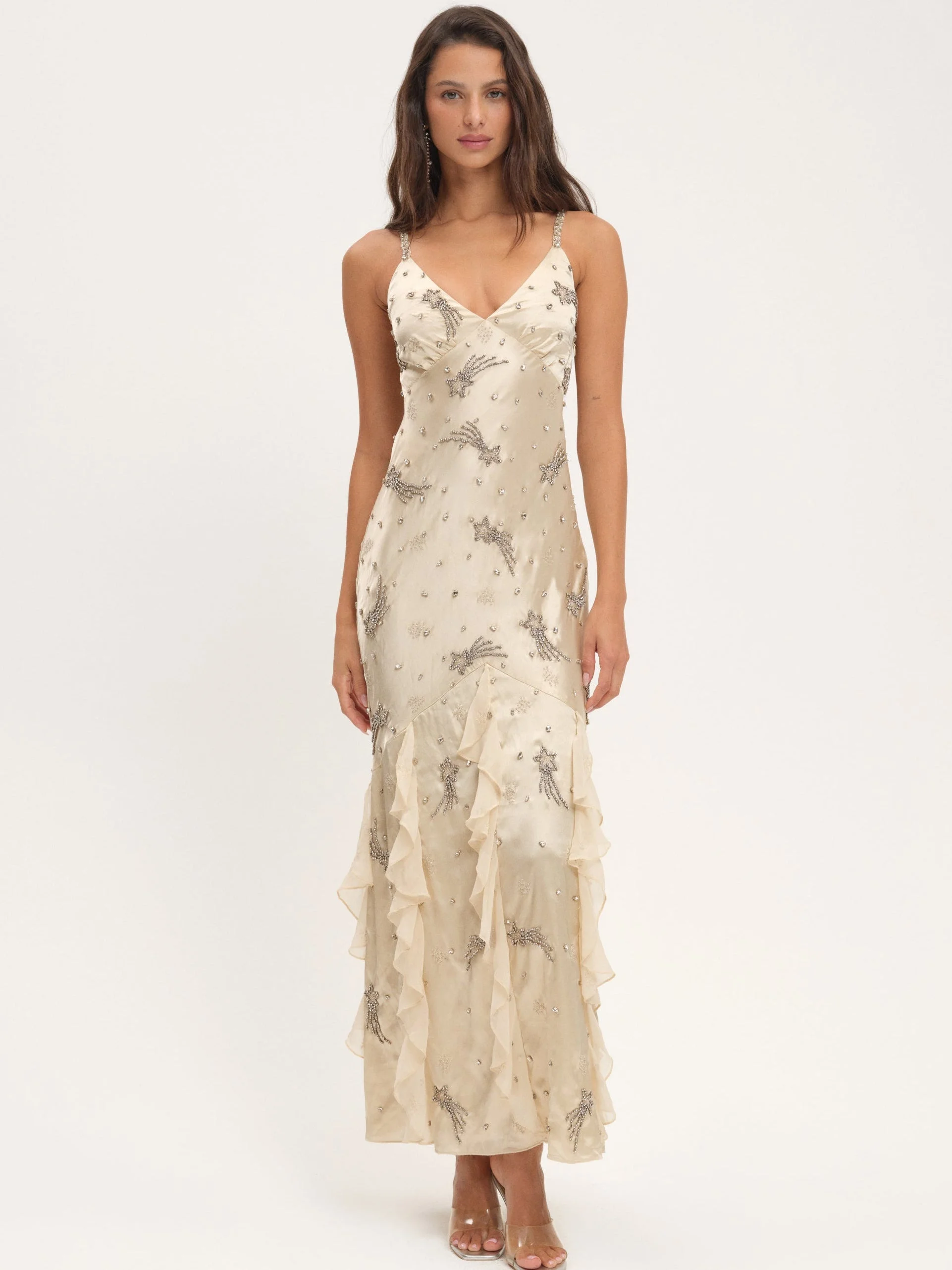 FL&L Keepsakes: A starlet's dream come to life: the Elea cream maxi dress shimmers under the light with its hand-beaded shooting stars that glimmer at every turn. This chiffon beaded gown features delicate triangle cups, slender adjustable straps, and a lace-up back that ties into a bow. Cascading ruffles fall dramatically from the skirt, catching the light like a trail of stardust. Fit Notes - True to size Style Notes - Fully lined - Shirred cups - Adjustable spaghetti straps that lace up and tie at the back neck - Invisible zipper at the side seam Fabric + Care - Crafted in 100% polyester - Lining is made of 100% polyester - Dry clean only