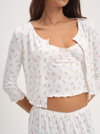 Effortless, pretty, and personal, the Elliana floral cardigan was designed to take you from the bedroom to brunch with total ease. This cropped cardigan spotlights a scooped neckline, functional button-front opening, three-quarter length sleeves, and is finished with lettuce edges. Pair with the Elliana Slip Dress for the complete co-ord set. Style Notes - Unlined Fabric + Care - Crafted in 95% polyester, 5% elastane - Machine wash cold - Only non-chlorine bleach - Tumble dry low - Cool iron - Do not dry clean