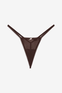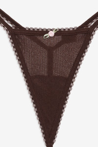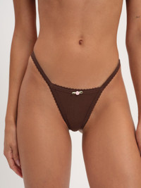 Designed for lounging, layering, and everything in between, the Elliana brown thong is perfect for cozy days in. This g string panty is adorned with scalloped picot trims and a rosette at center front. Pair with the Elliana Bralette for the complete lingerie set. Style Notes - Modal gusset lining - G-string back panty coverage Fabric + Care - Crafted in 95% polyester, 5% elastane - Gusset is made of 100% viscose - Machine wash cold - Only non-chlorine bleach - Tumble dry low - Cool iron - Do not dry clean