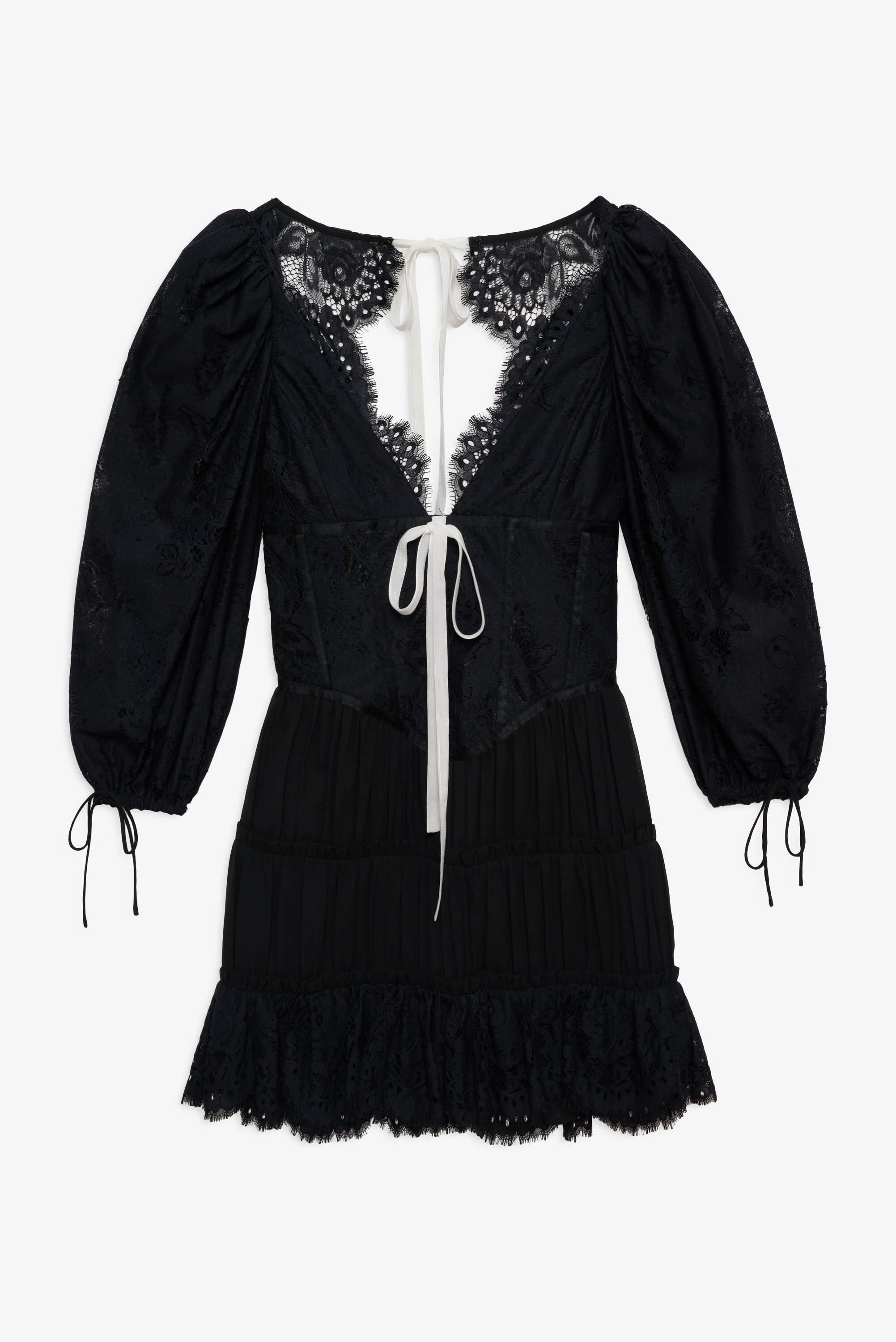 Update your pre-fall closet staples with the Ellis black mini dress—a romantic silhouette with rose and scalloped lace detailing, a corset style bodice, and a ruched skirt. This puff sleeve mini dress is finished with a sweet white bow. Style Notes - Fully lined bodice and skirt - Sleeves unlined - Invisible zipper at center-back Fabric + Care - Crafted in 100% polyester - Contrast 1 is made of 100% recycled polyester - Lining is made of 100% recycled polyester - Dry clean only