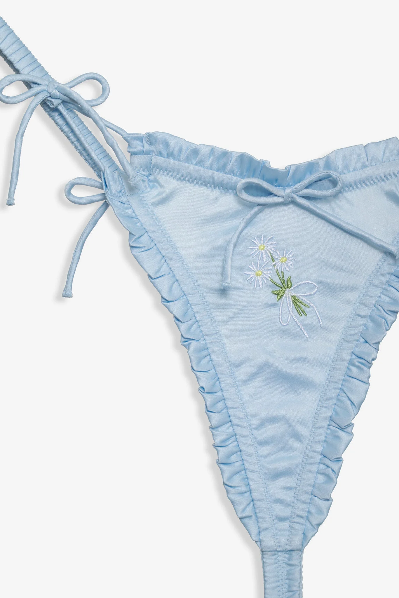 A bestselling silhouette—the Everyday blue thong highlights the beauty of everyday rituals. This thong underwear is accentuated with romantic floral bouquet embroidery and skinny tie bows. Pair it with the Everyday Bralette for a chic and effortless lingerie set. Style Notes - Low rise - High-cut leg - Thong back coverage - Scrunchie elastic hip straps Fabric + Care - Crafted in 60% polyester, 40% elastane - Machine wash cold separately - Tumble dry low, do not iron